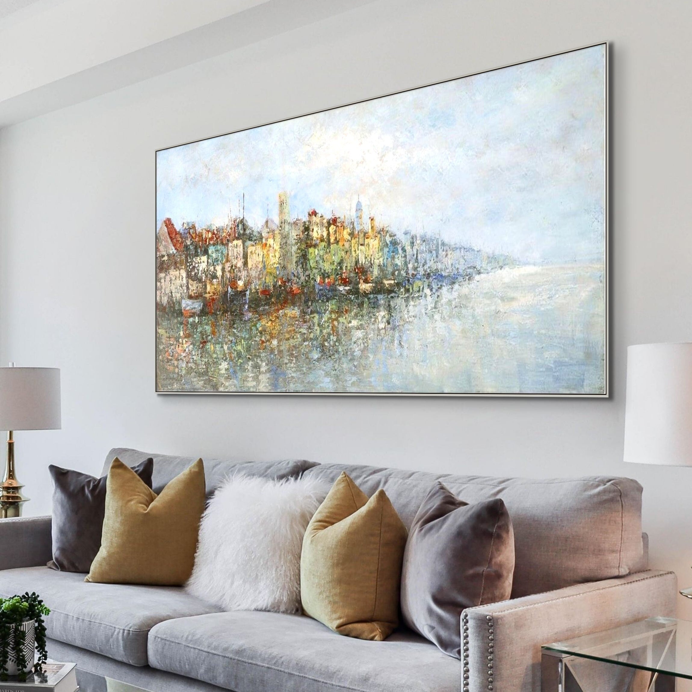 Crafted with premium quality acrylics on a sturdy canvas, this original city landscape painting stretches across a generous expanse, making it an ideal statement piece for any room. By choosing this original wall painting, you're inviting a slice of the city's heart into your home. Let the abstract blend of urban charm and lakeside tranquility wash over your walls!