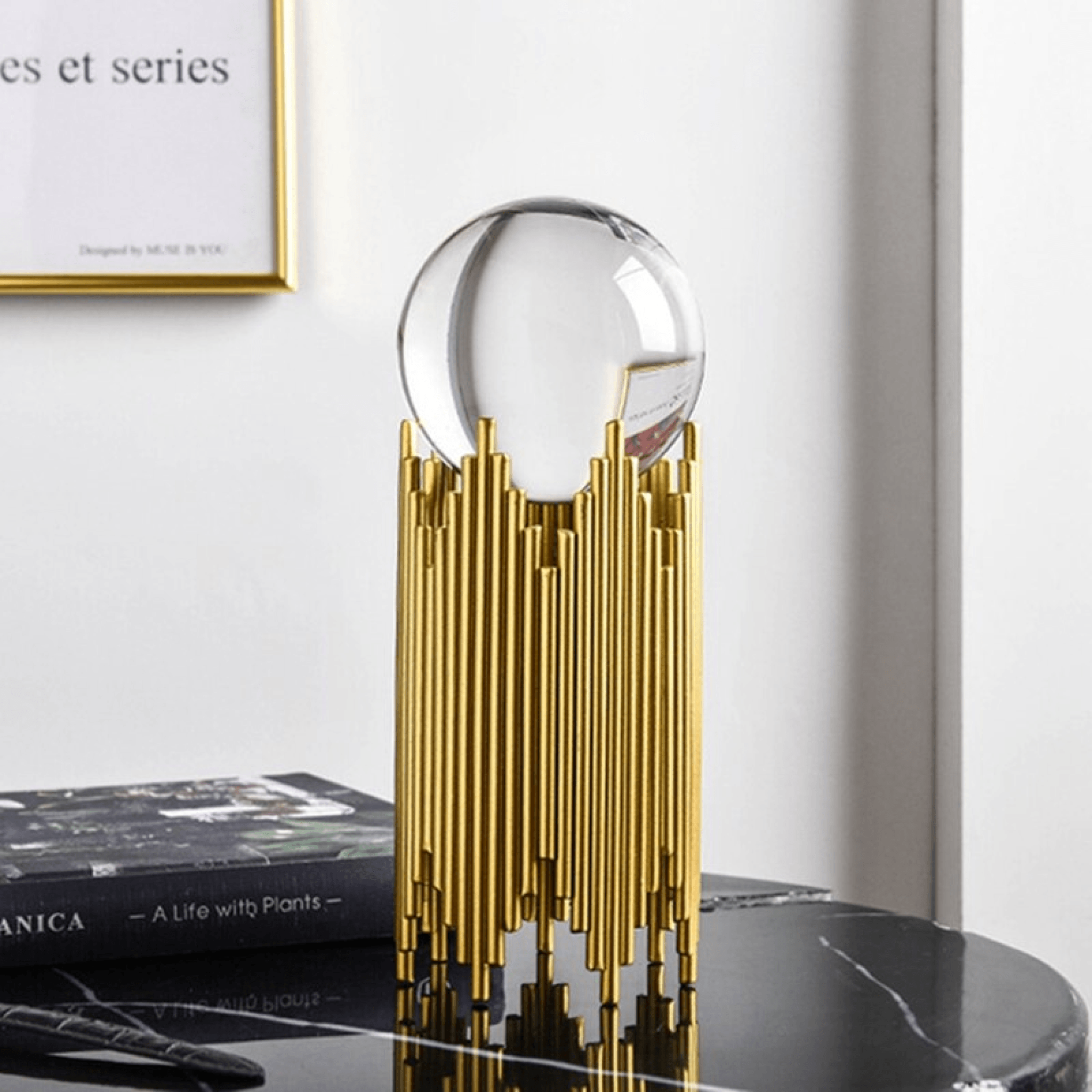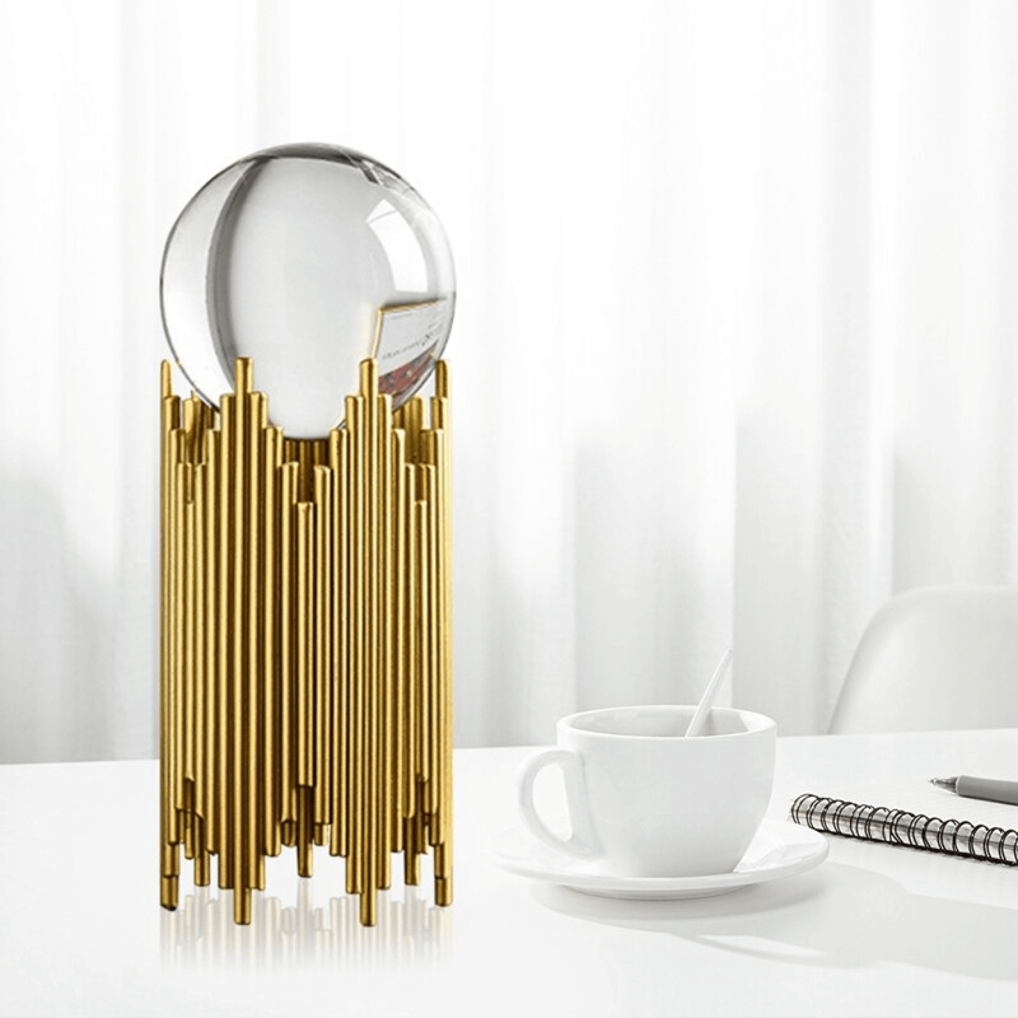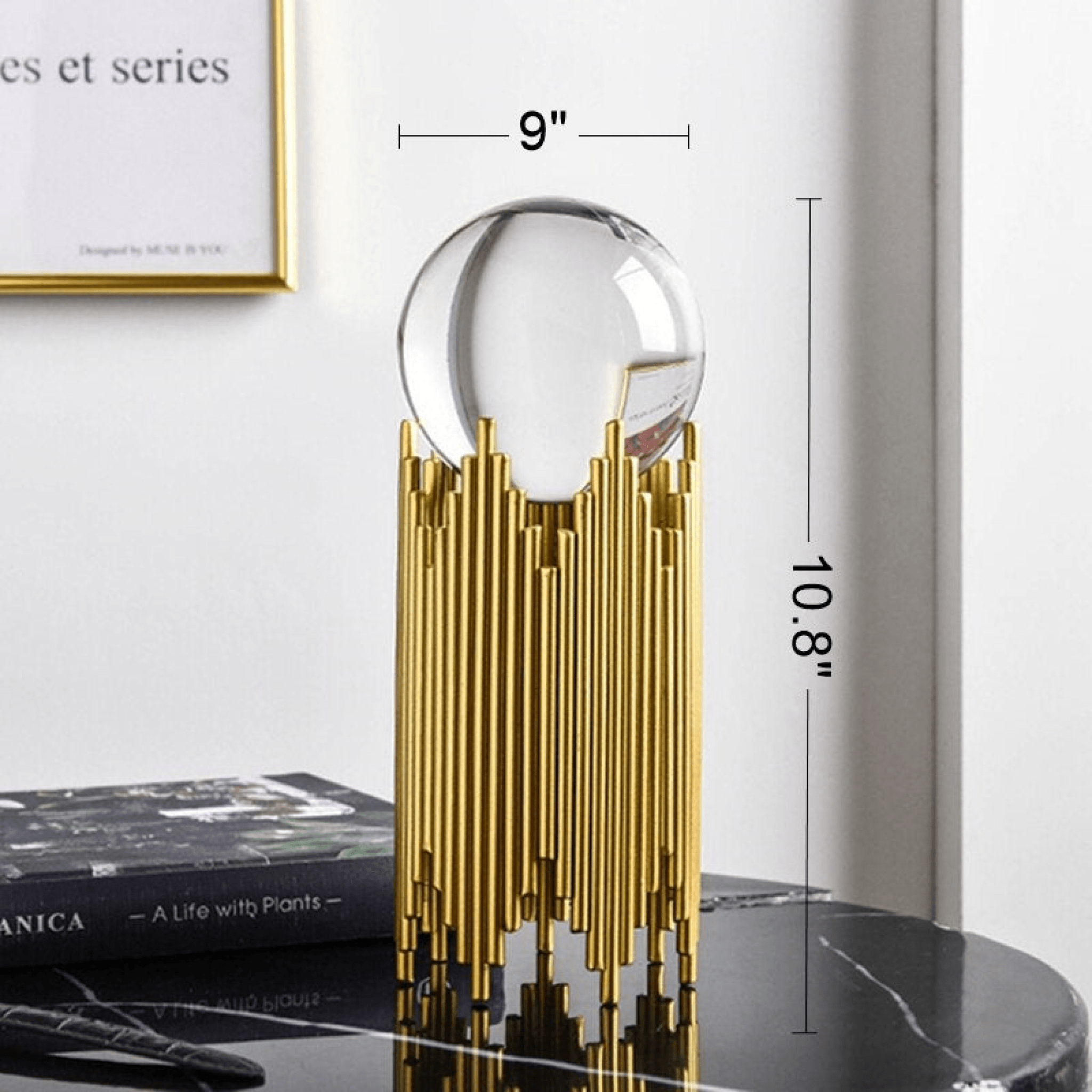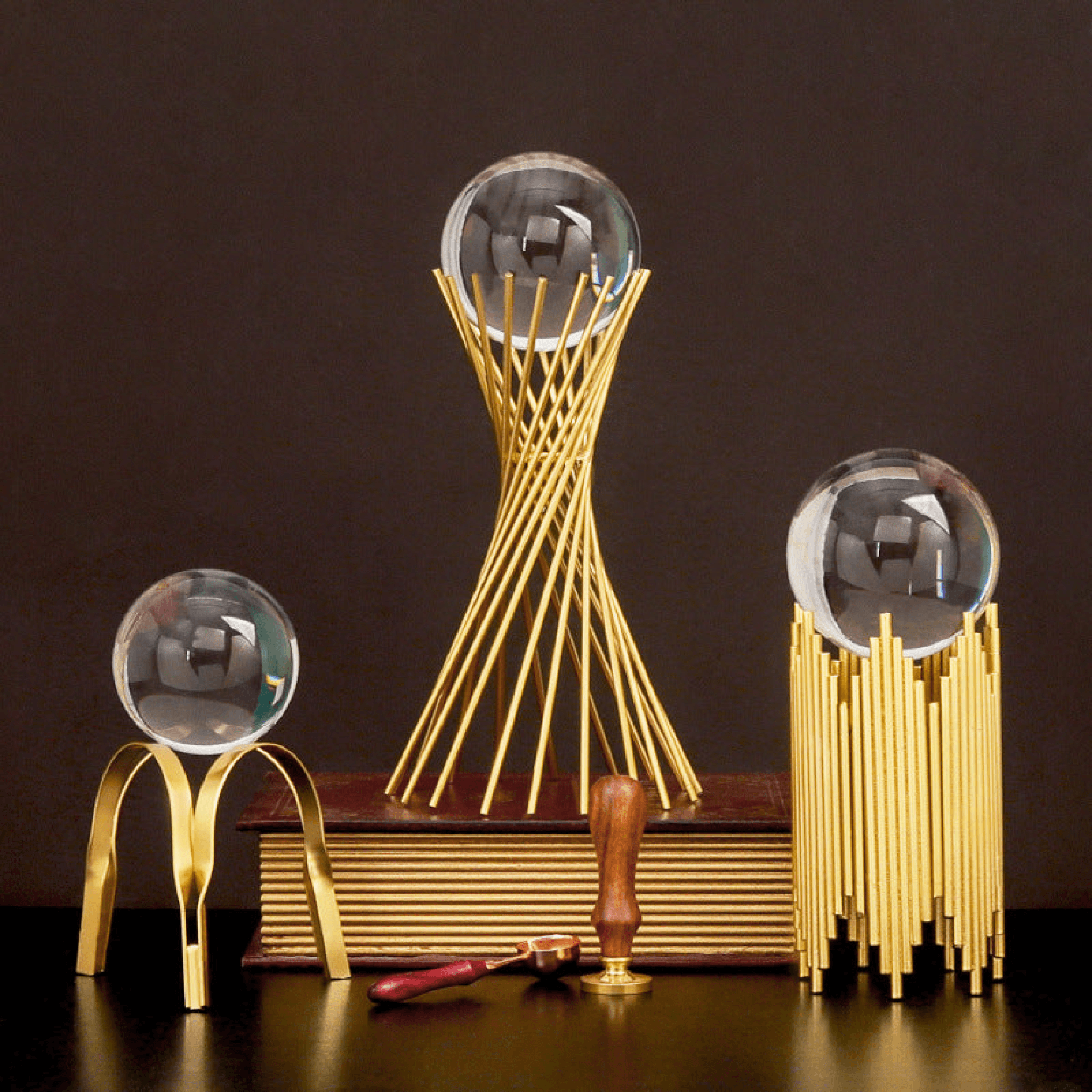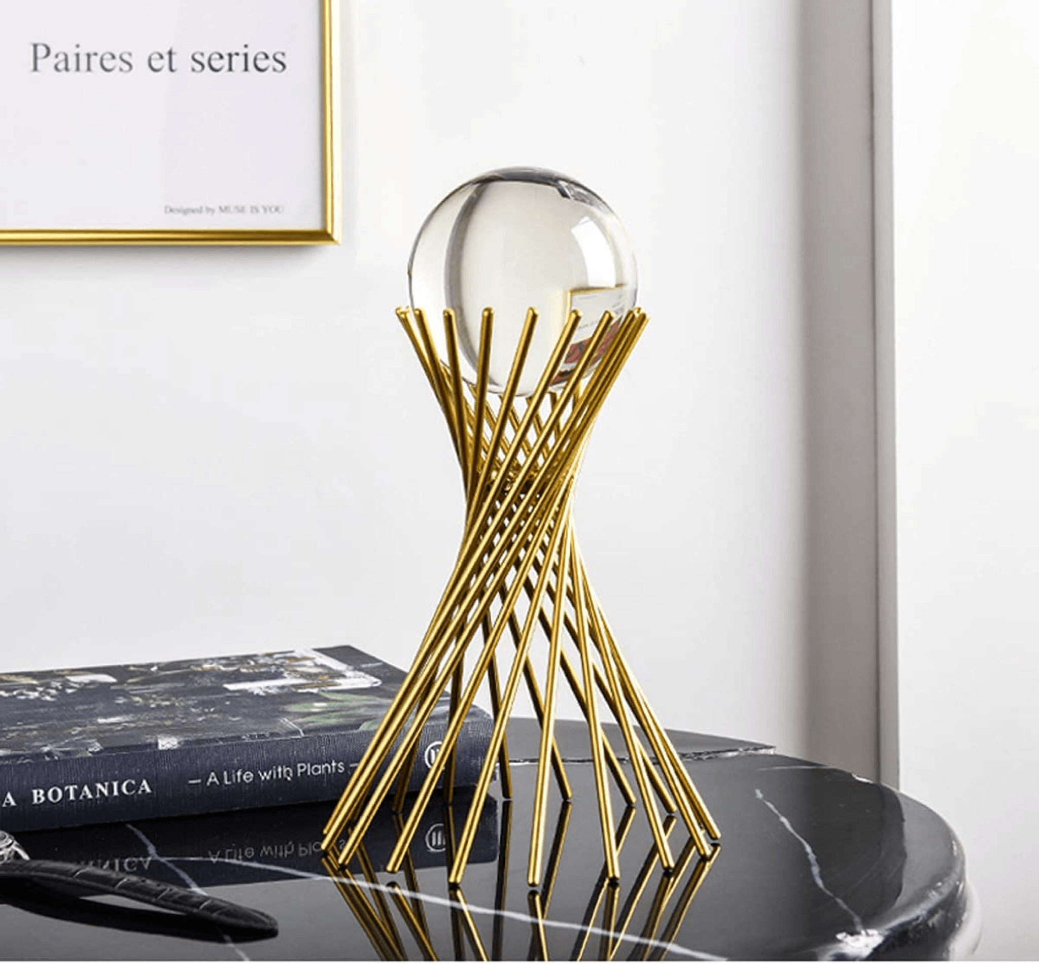 Transform your table, desk, or office cubicle into an art gallery with these golden abstract pieces. These unique metal ornaments are the perfect way to add a touch of glamour to your living room, bedroom, home office, or entryway. And with a delicate crystal ball on top, they're sure to catch the eye. Whether you're looking for something new to brighten up your space or a unique gift for a friend for any occasion, these pieces are sure to impress. Available in various sizes for depth, dimension, and coordinated look.
