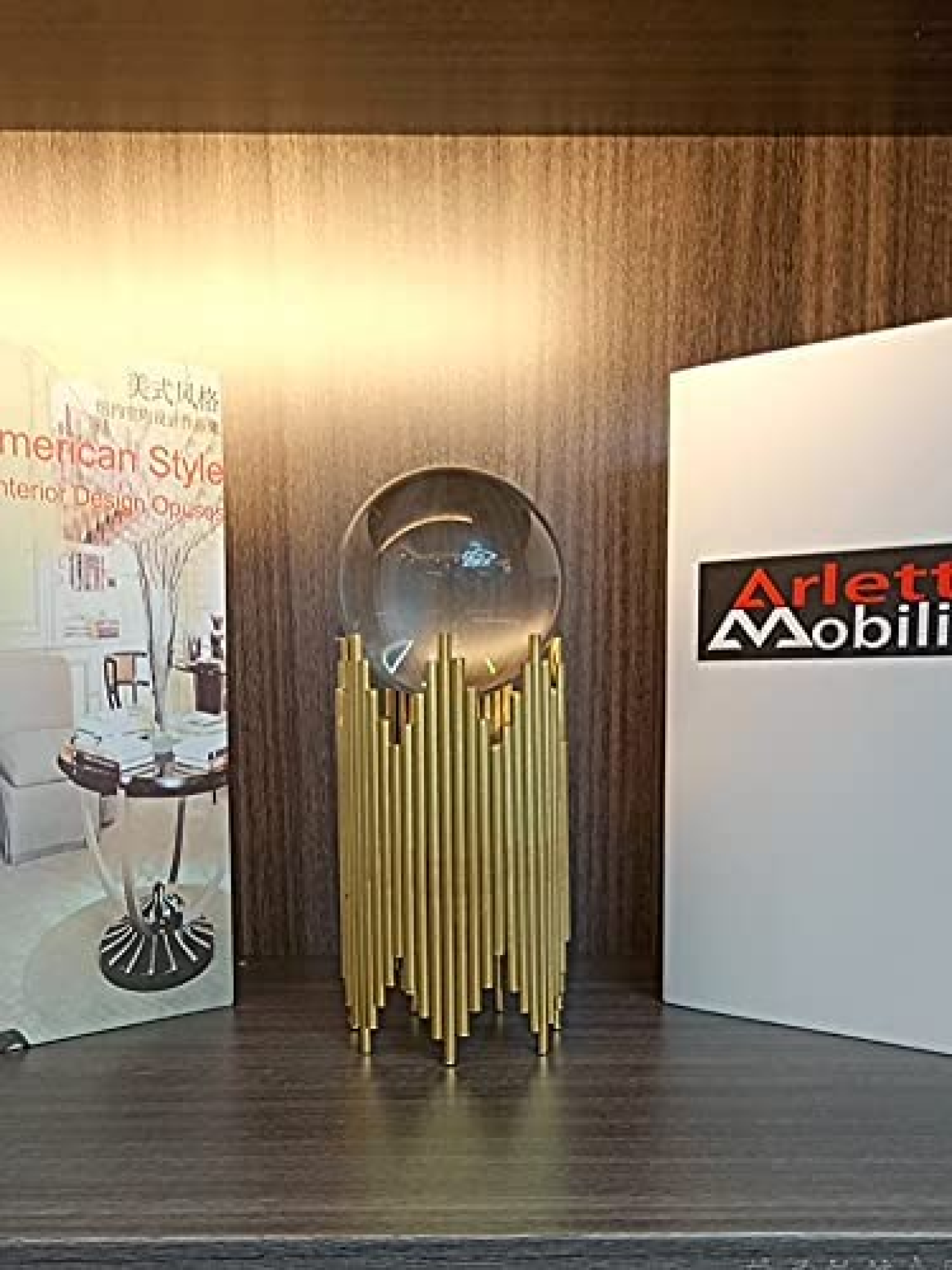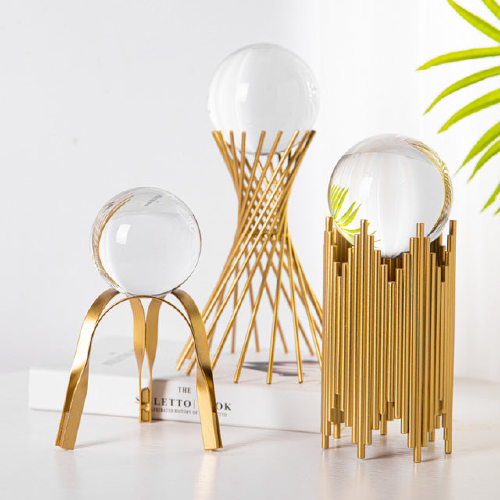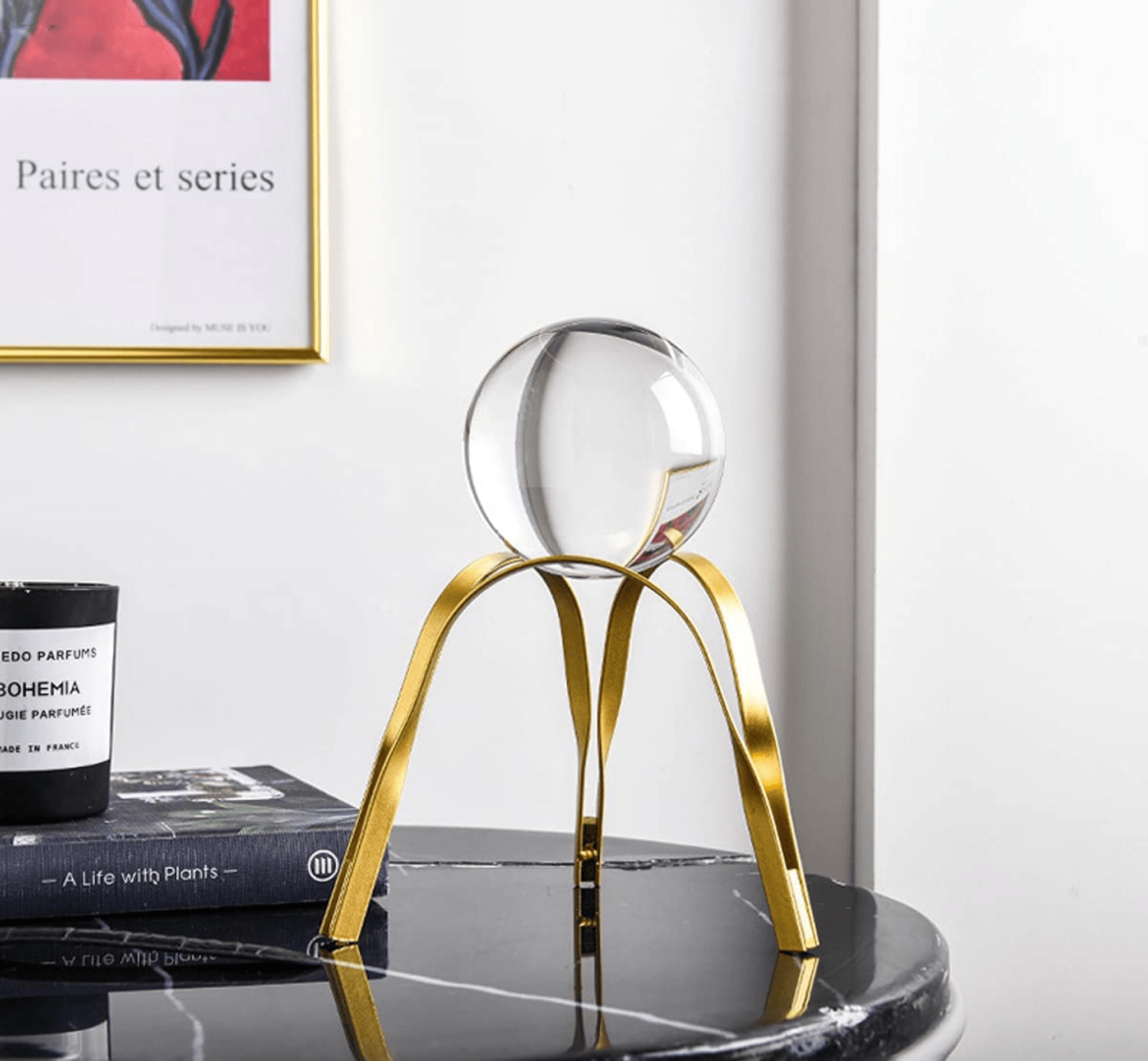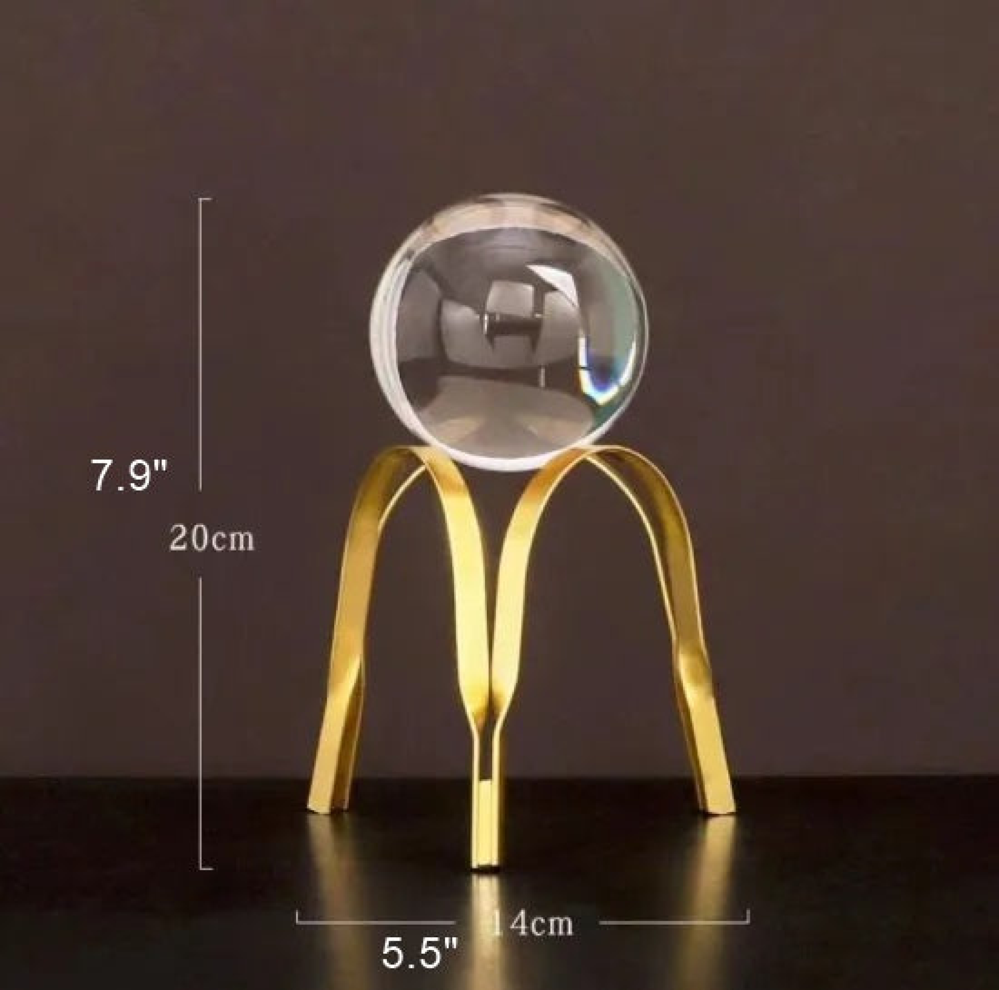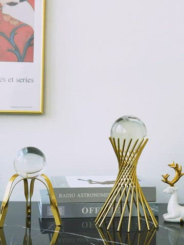 Transform your table, desk, or office cubicle into an art gallery with these golden abstract pieces. These unique metal ornaments are the perfect way to add a touch of glamour to your living room, bedroom, home office, or entryway. And with a delicate crystal ball on top, they're sure to catch the eye. Whether you're looking for something new to brighten up your space or a unique gift for a friend for any occasion, these pieces are sure to impress. Available in various sizes for depth, dimension, and coordinated look.