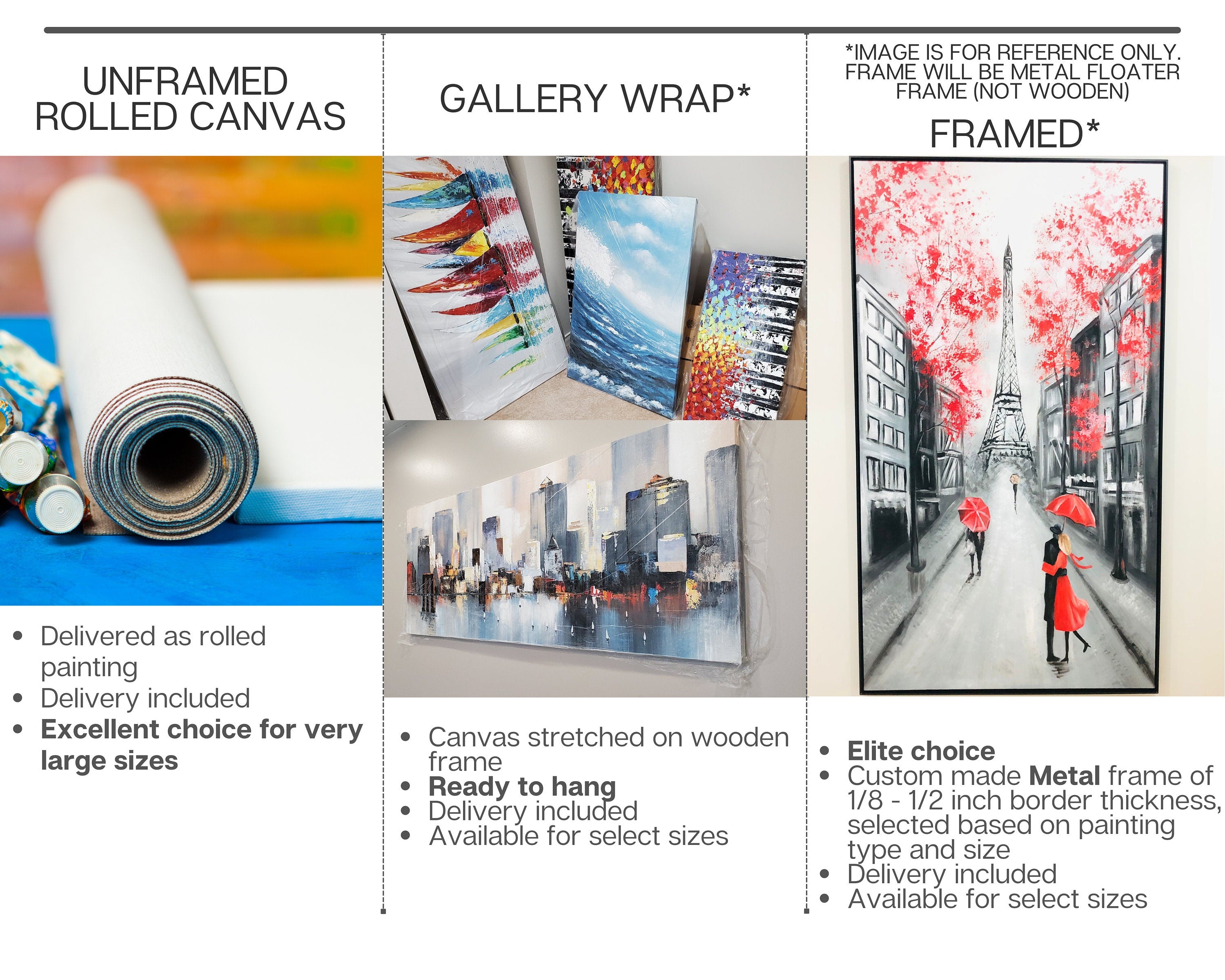 1. Unframed-Rolled Canvas: Delivered as rolled canvas (you need to get it stretched)