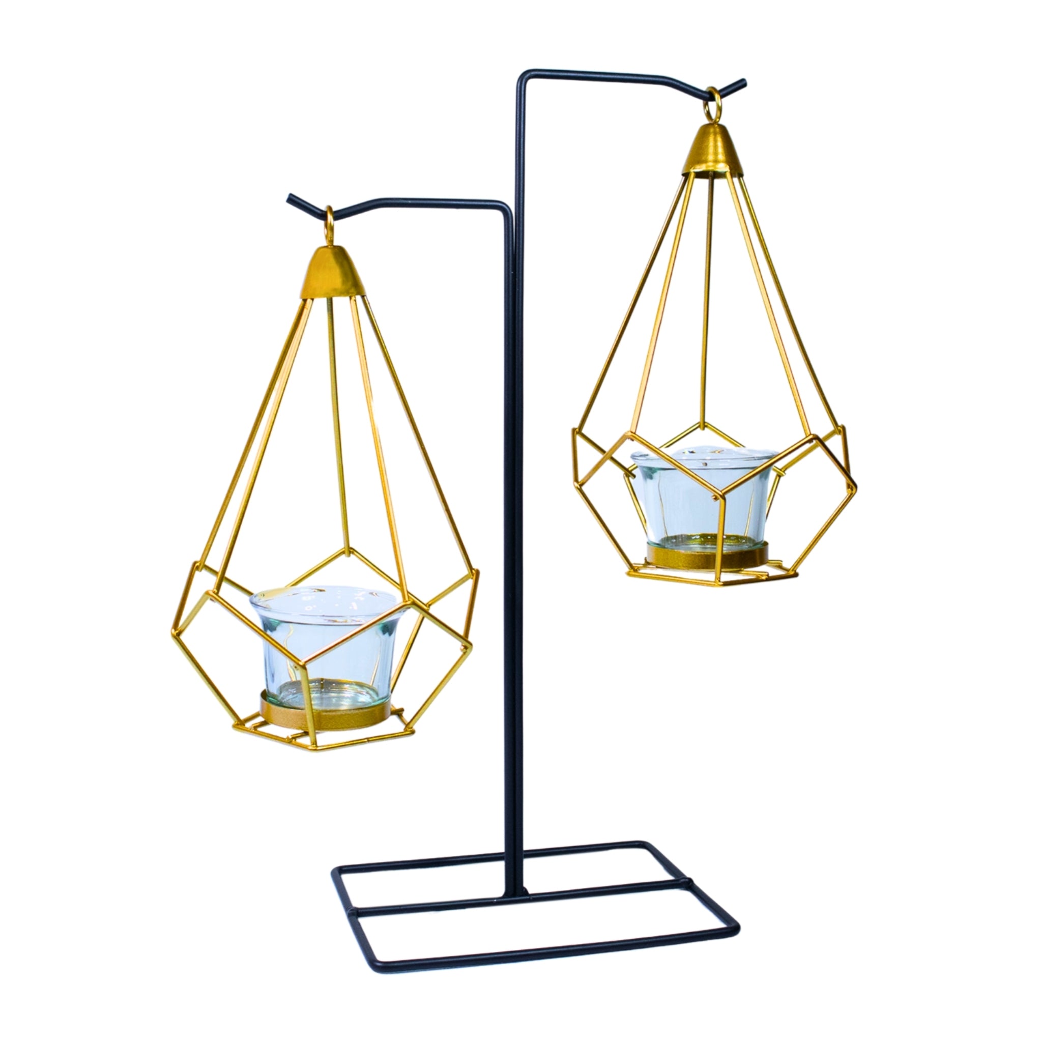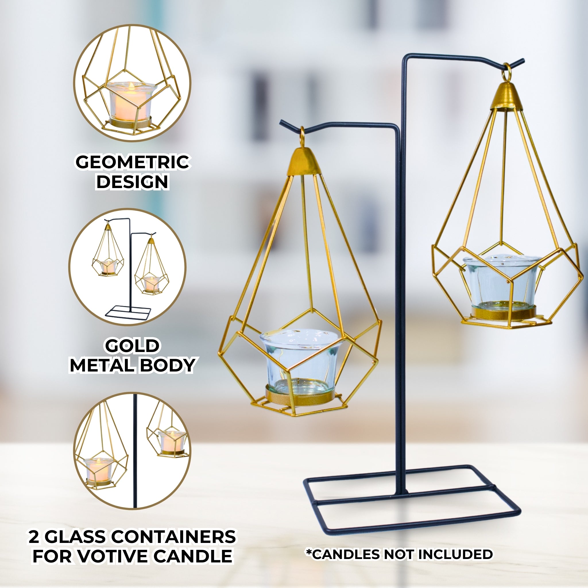 Gold Candle Holder, Metal Frame, 2 Glass Containers, 14" Home Decor
