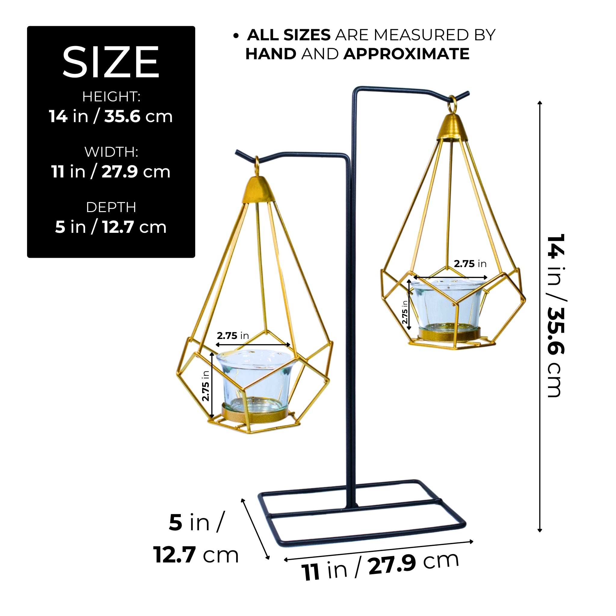 Illuminate your home with this elegant Gold Metal Candle Holder with 2 Glass Containers. Made of premium metal and glass, the 14 inch (36 cm) candle holder decor guarantees longevity of use. Finished in glamorous gold, this decorative accent works in any space. Add glam to your traditional or modern space by displaying this gold candle holder as an entryway table decor, coffee table centerpiece, or mantle decoration. There are so many possibilities you can do with this gold ornament; and can even be incorporated into wedding decors or other events including Thanksgiving, Christmas, and more. The gold centerpiece is also an elegant return gifts for housewarming to wish new homeowners a bright future in their new home.