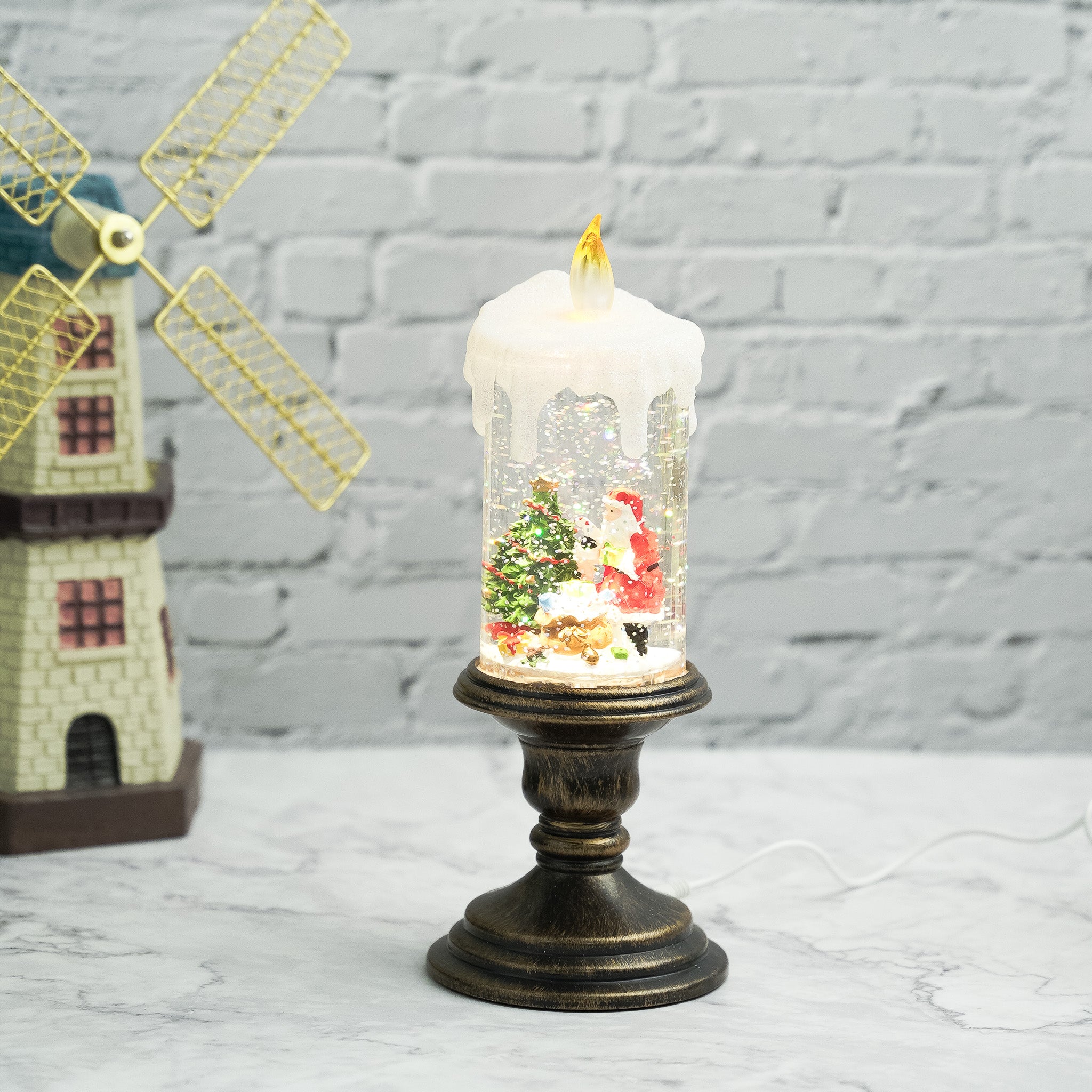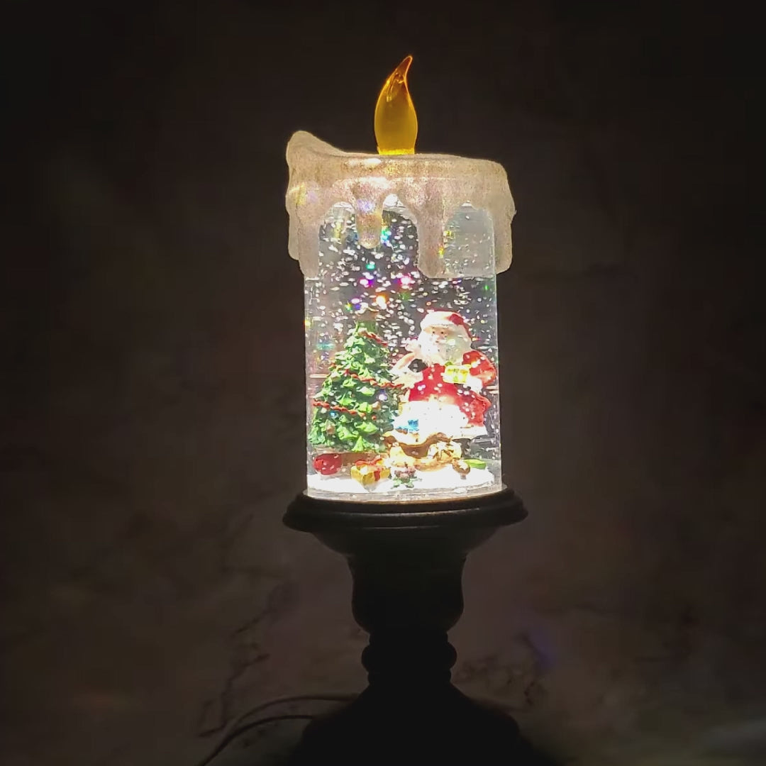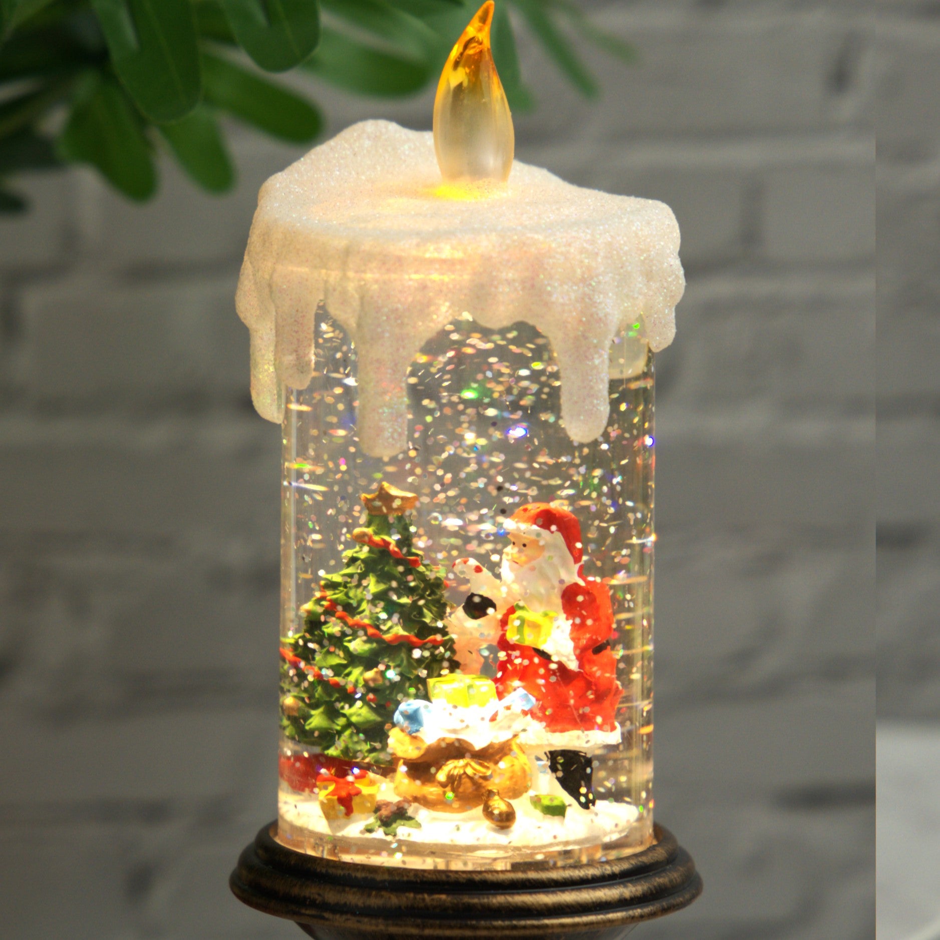 - Features christmas themed electric candle with floating snowflakes, santa, christmas tree, gifts, lights and music. Charming and mesmerising.
