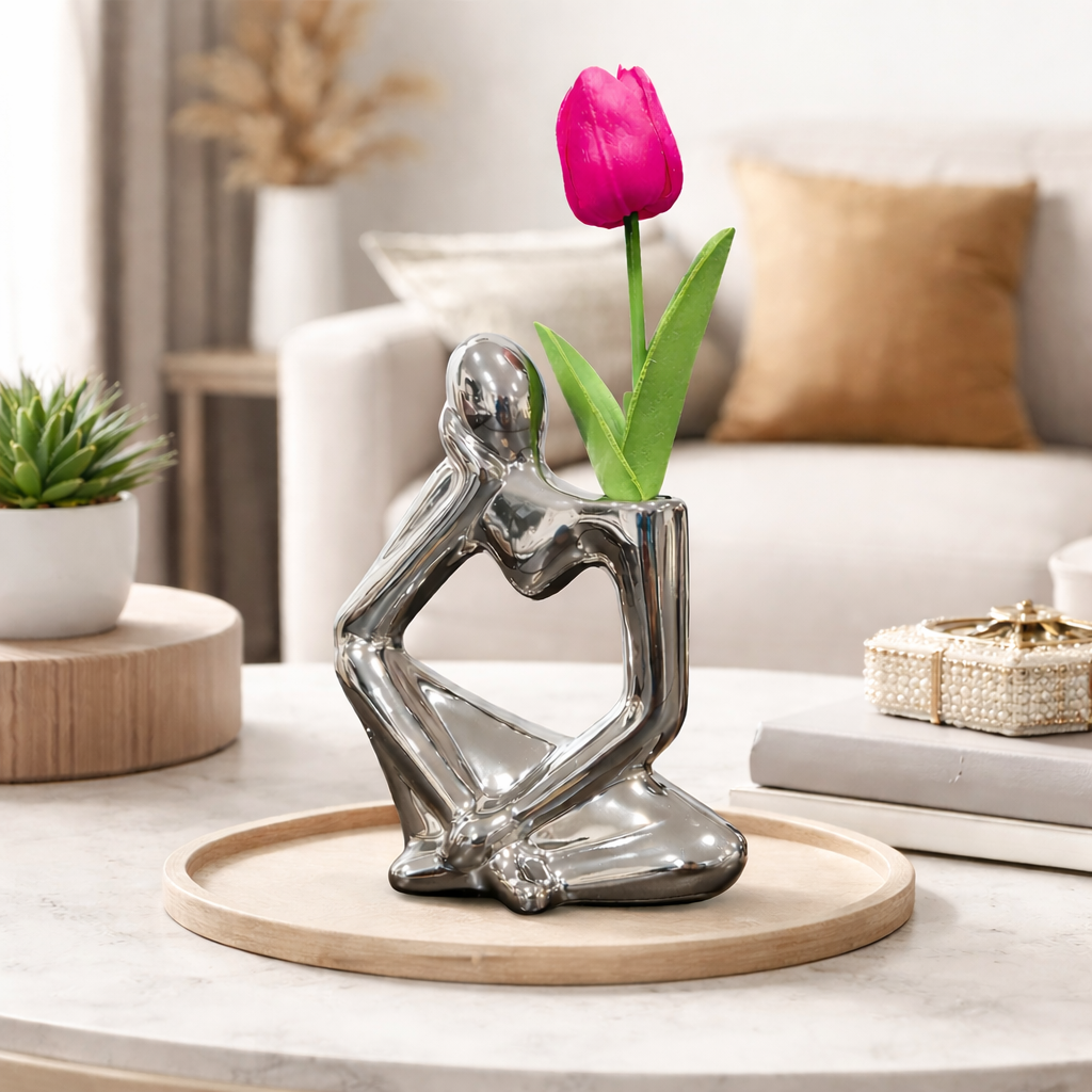 Add a touch of modern philosophy to your decor with this striking Silver Ceramic Thinker Statue. Blending the classic "Thinker" silhouette with the functionality of a bud vase, this piece is designed for those who appreciate art that serves a purpose. Whether it's perched on a bookshelf or centering your desk, it turns a single bloom into a conversation starter.