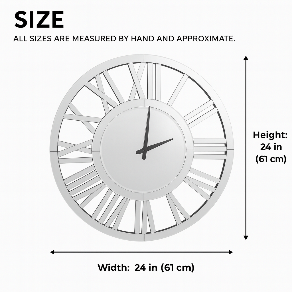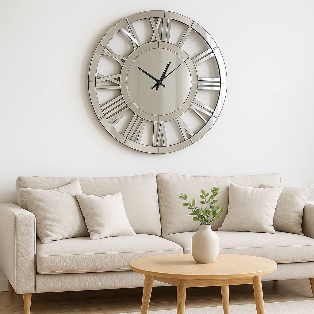 Add a touch of sophistication to your interiors with this luxury 60 cm mirrored wall clock, designed to blend function with timeless elegance. Its vintage Roman numerals, slim metal hands, and silent sweep movement ensure easy readability and a tranquil, tick-free environment. Crafted from premium mirrored glass, and rust-resistant metal, this decorative wall clock is built for durability and long-lasting beauty. Whether displayed in a living room, bedroom, or office, its versatile design is ideal for any interior styling - from classic to modern contemporary An ideal choice for a housewarming, wedding, or anniversary gift, this elegant wall clock symbolizes refined taste and comes with professional after-sales support for a seamless shopping experience.
