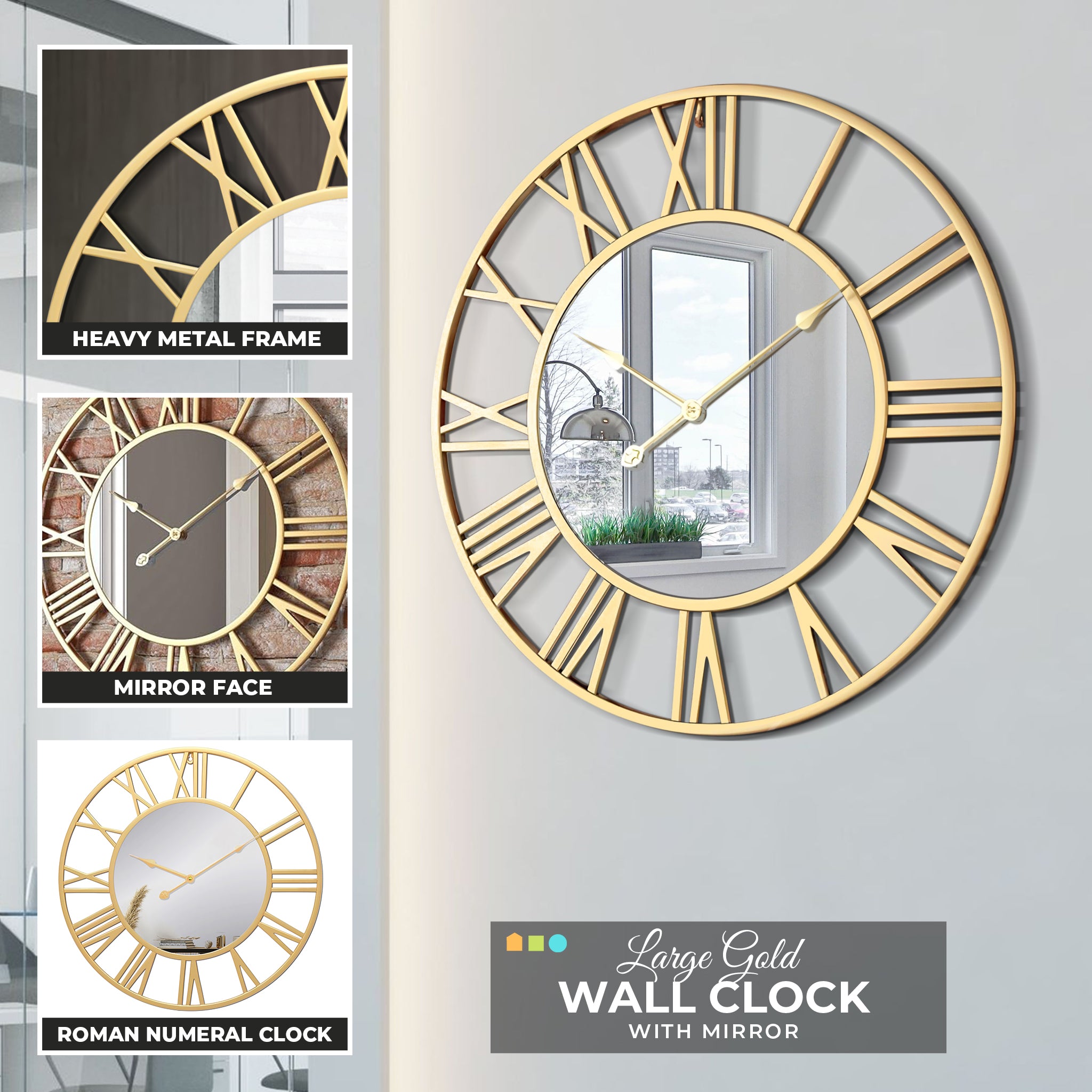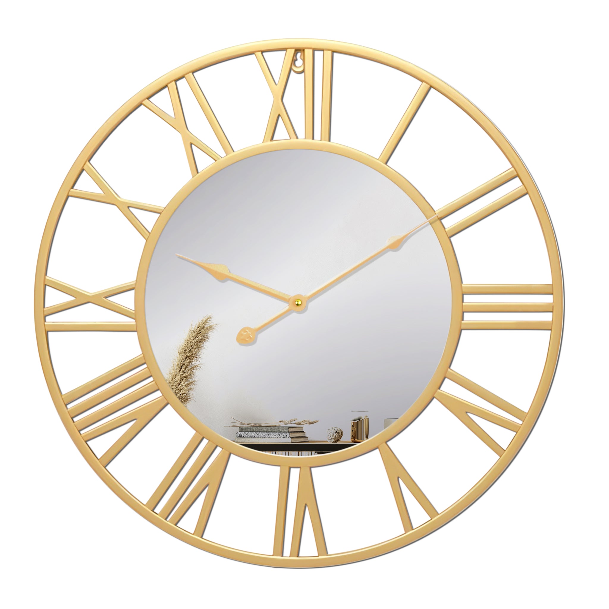 Large Golden Wall Clock with Mirror, 24" Silent Roman Clock, Heavy Metal, Living Room Wall Decor