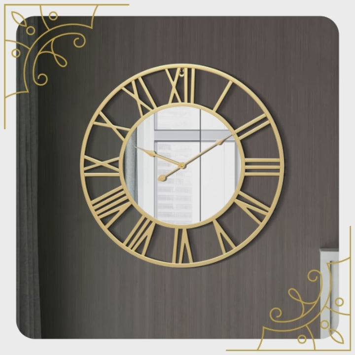 Enhance your home décor with our 60 cm or 24 in golden wall clock featuring a mirror face and silent, non-ticking movement. Its elegant gold finish and contemporary design make it a standout piece for any room. Crafted from high-quality metal with a durable, sleek finish, this 24-inch clock is perfect for gifting or upgrading your space. Ideal as a unique housewarming gift. This Roman Numeral clock is perfect for both vintage and modern settings. Securely packaged, lightweight, and so easy to mount on walls, it's a worthy purchase for your home, office, or commercial space.