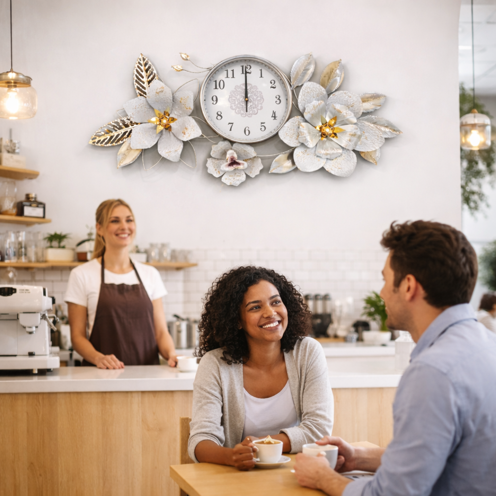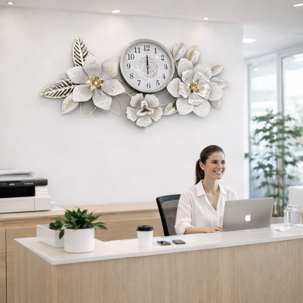 Transform a bare wall into a breathtaking focal point. This stunning oversized wall clock blends functional timekeeping with high-end metal artistry. Featuring intricate, hand-finished silver blooms and gold accents, it’s more than just a clock; it’s a statement piece that brings elegance and a sense of "wow" to any room. At 121 cm wide and 56 cm tall, it's not just a functional time keeper but also a luxurious horizontal wall art perfect for any type of wall.