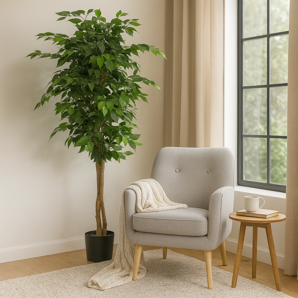 Bring lush greenery and timeless elegance to your indoor spaces with this 6 ft Artificial Ficus Tree. Featuring evergreen green leaves and a realistic, nearly natural touch, this large faux ficus tree adds a vibrant, lifelike presence to your home, room, office, living room, or dining area. The tree’s sturdy black cement base ensures stability, while the textured trunk and branches enhance its natural appearance. Built sturdy and durable, this decorative tall plant requires zero maintenance. NOTE: Apply UV-resistant spray if placed outdoors to protect the faux plant from extreme heat.