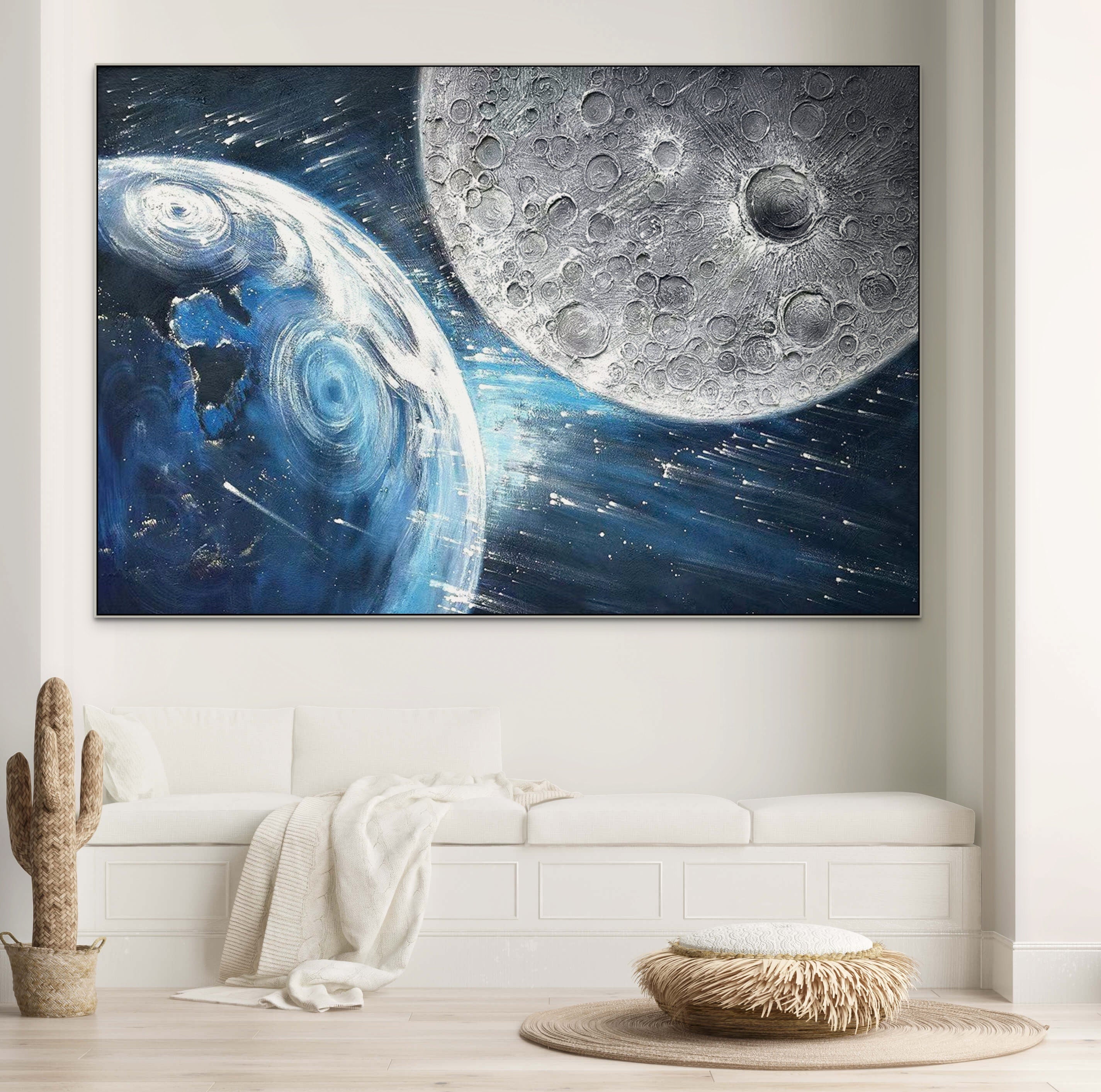 Crafted with passion and precision, this large wall art features a textured surface that adds depth and dimension. This framed wall art is designed to be the focal point of any room. The earth and moon painting's unique textured technique offers a contemporary take on space art, making it an ideal piece for those who appreciate the fusion of modern artistry with the timeless allure of the cosmos. This hand-painted wall art brings the intrigue of outer space art into your home, creating an atmosphere of wonder and exploration.