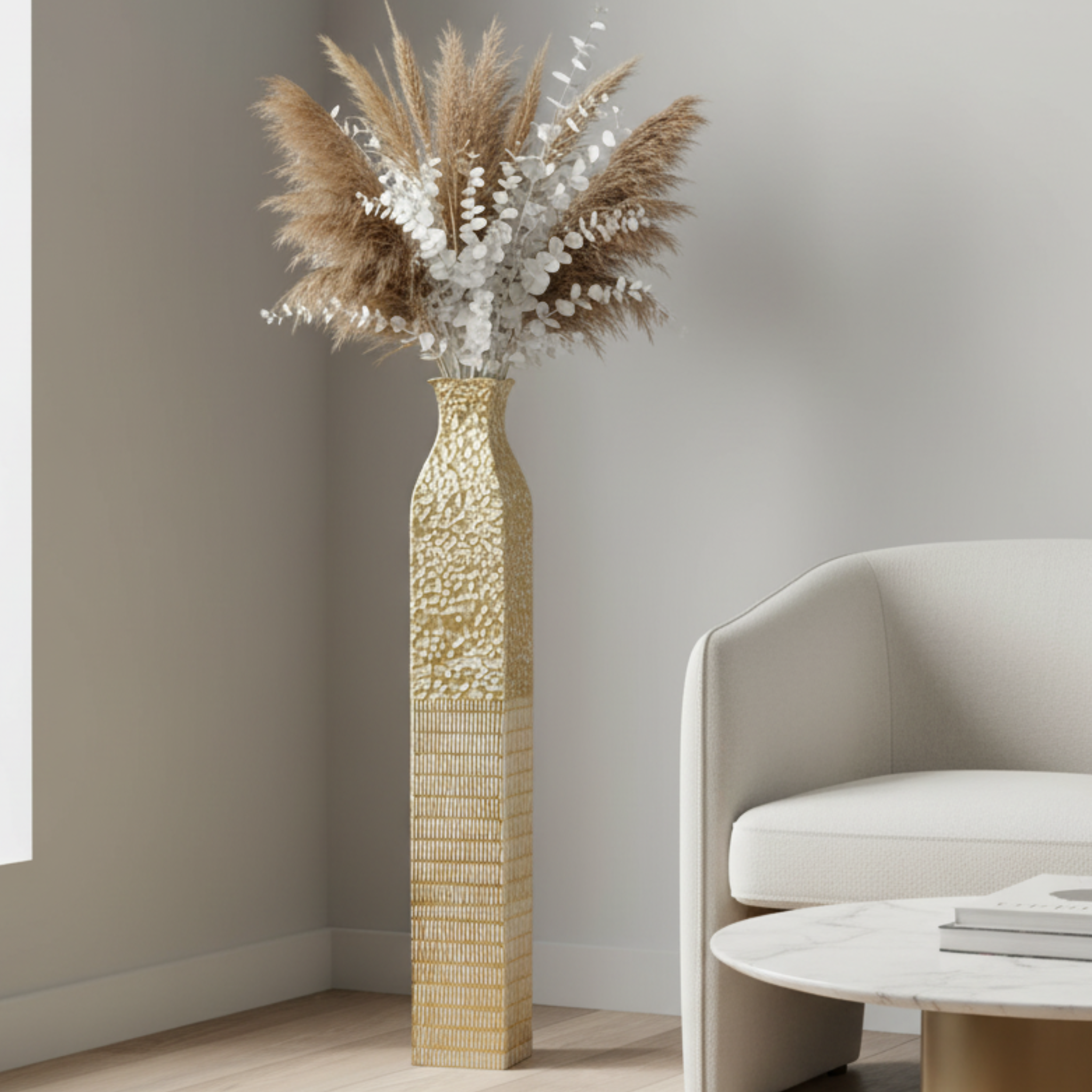 Looking to add some flair to your home or office? This tall floor vase is just what you need! Thoughtfully crafted with a unique design, this decorative vase brings elegance and personality to any space. Whether your style is farmhouse, vintage, or modern, this large decorative vase blends in beautifully. The large vase stands approximately 42 inches tall, ideal for creating a striking visual impact. Perfect as foyer decor, entryway decor, or entrance way ideas, the metal vase features a sturdy build and a classy gold finish with a rare, elegant pattern. Fill it with pampas grass, dried flowers, or other faux floral arrangements to express your style—just be sure not to fill it with water.