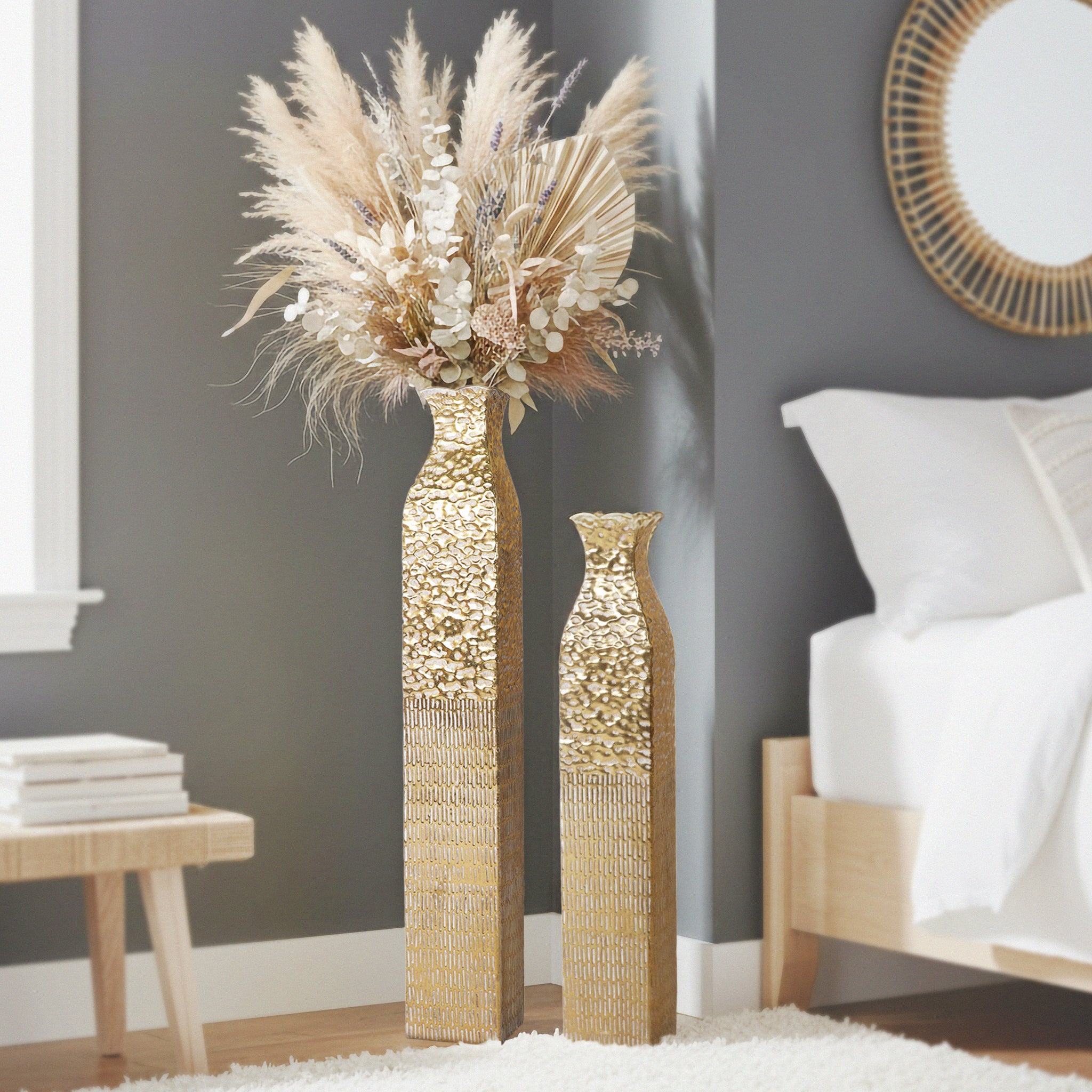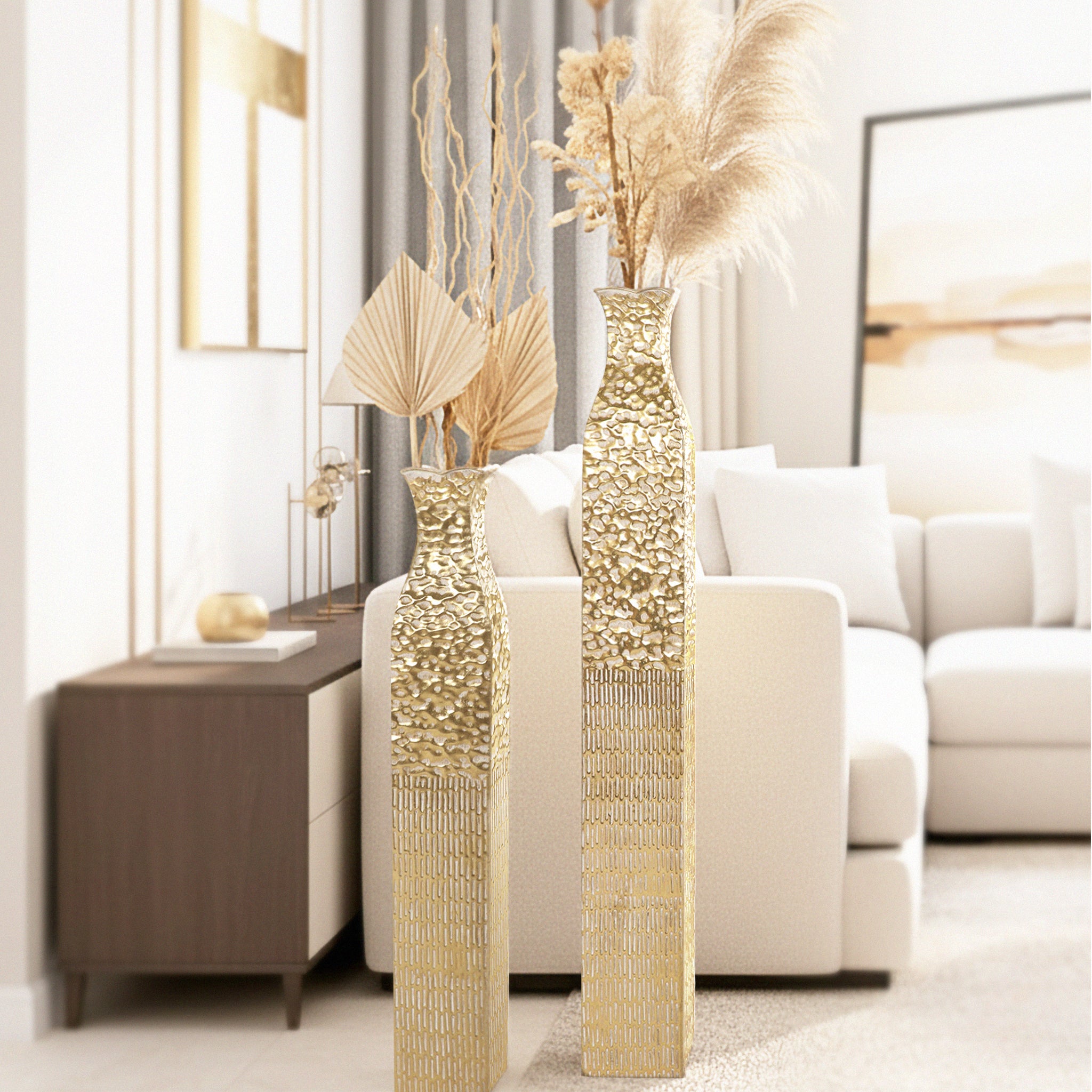 Looking to add some flair to your home or office? These tall floor vases are just what you need! Thoughtfully crafted with a unique design, this decorative vase set brings elegance and personality to any space. Whether your style is farmhouse, vintage, or modern, these large decorative vases blend in beautifully. The large vase stands approximately 42 inches tall, and the medium one measures around 35 inches, making them ideal for creating a striking visual impact. Perfect as foyer decor, entryway decor, or entrance way ideas, these metal vases feature a sturdy build and a classy gold finish with a rare, elegant pattern. Fill them with pampas grass, dried flowers, or other faux floral arrangements to express your style—just be sure not to use water.