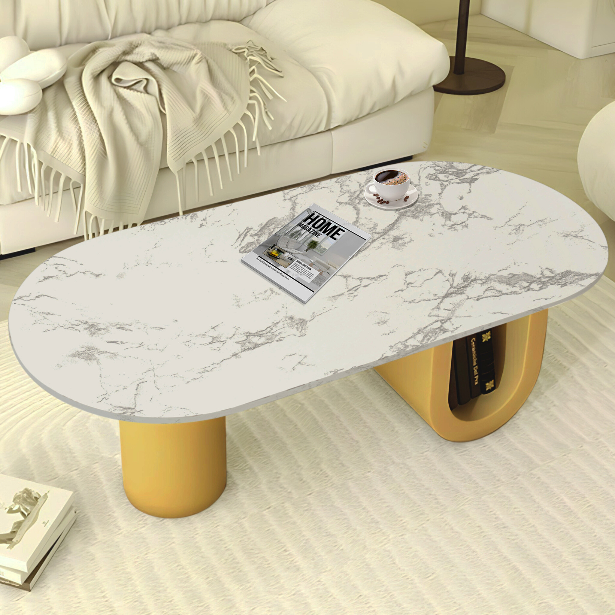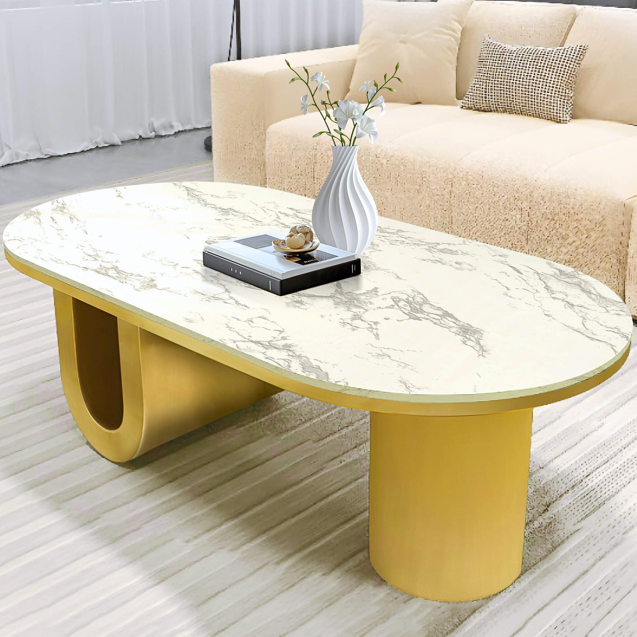 Improve your living space with the Designer Coffee Table featuring a luxurious 48" white marble top and a sleek metal blocks golden base. This modern coffee table seamlessly blends elegance and functionality, offering a chic centerpiece for any contemporary home. The stunning marble top mimics the beauty of real stone without the upkeep, while the bold matte black geometric base adds stability and a striking visual contrast. Perfect for living rooms, lounges, or office spaces, this coffee table is designed to impress and stand the test of time. Note: Minor variations in marble top color and grain are to be expected due to the hand-cut nature of the piece. Each item is uniquely crafted and, while it will closely resemble the photos, no two are exactly alike.