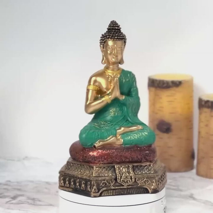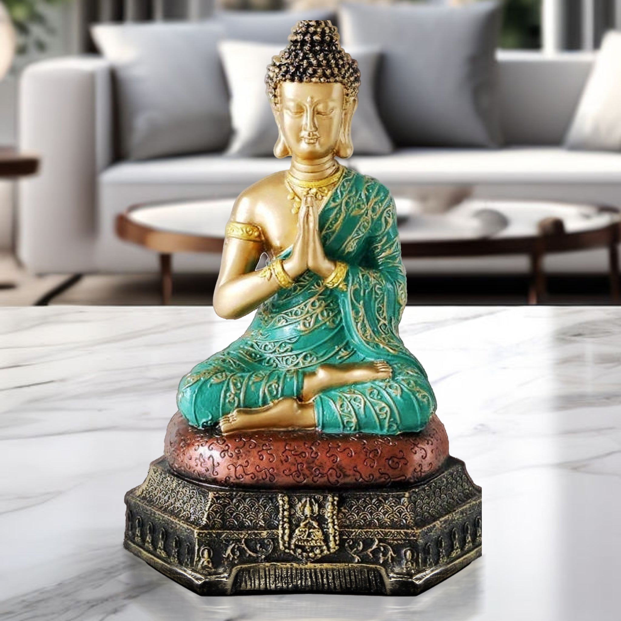 Small Buddha Statue, 9" Religious Decor Gifts, Green Gold Tabletop Desktop Shelf Prayer Room Ornament
