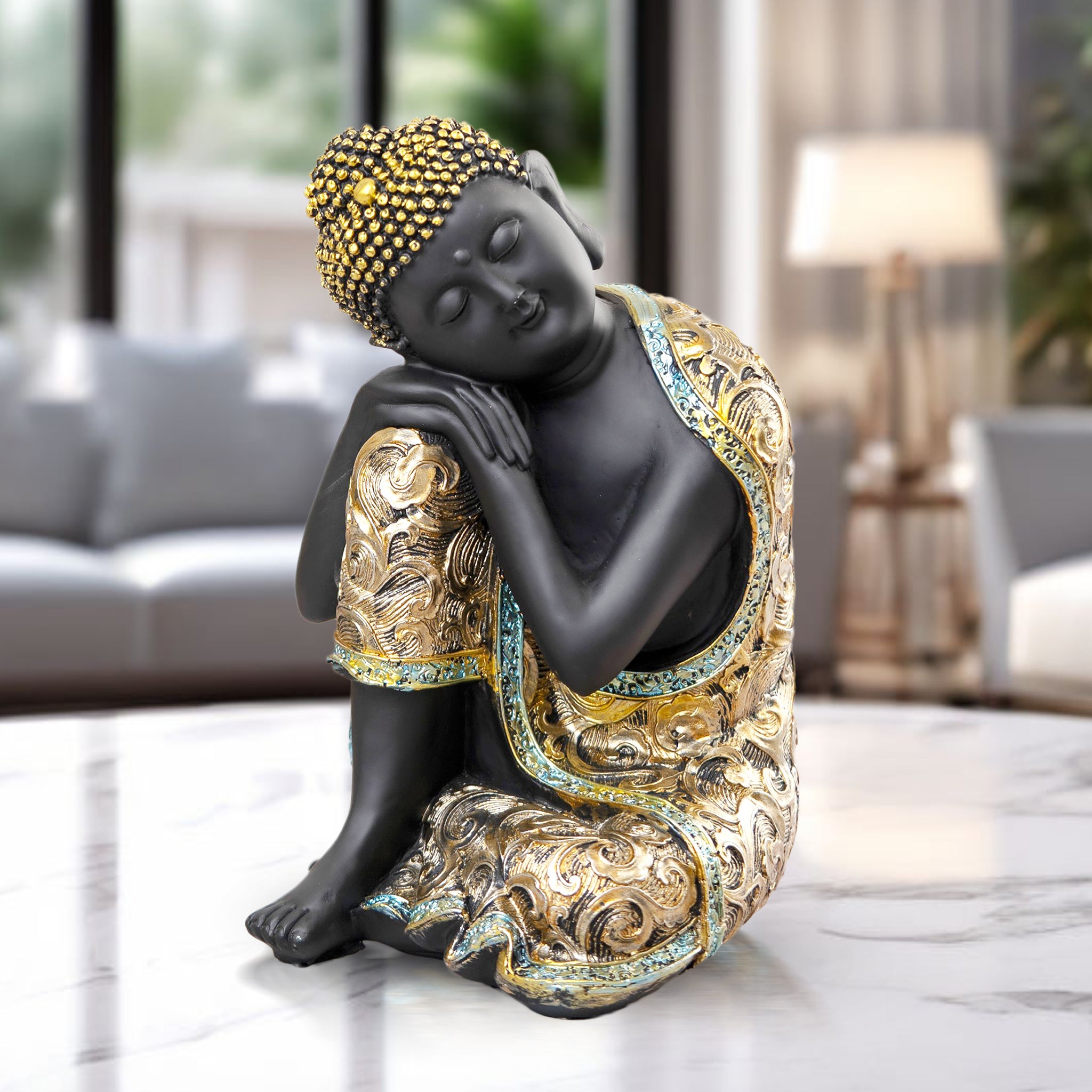 Enhance your home with this small tabletop Buddha statue, a stunning piece of indoor decor that blends modern sculpture with rustic vintage charm. Crafted from high-quality resin and finished in elegant gold and black, this decorative figurine brings a sense of spiritual calm and good luck to any setting — be it your desk, desktop, bedroom, or meditation room. Rooted in Buddhism and Hindu god traditions, this serene figure radiates positive energy, making it a meaningful housewarming gift or a beautiful addition to your Zen-inspired home. Whether used in a feng shui layout, a pooja space, or simply as a decorative statue, it symbolizes wealth, harmony, and inner peace. Perfect for a home altar, yoga corner, or as a peaceful touch on a small table, this spiritual statuary is more than just decor—it's a statement of mindfulness and intention.