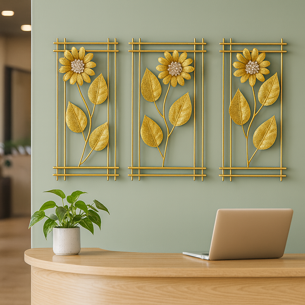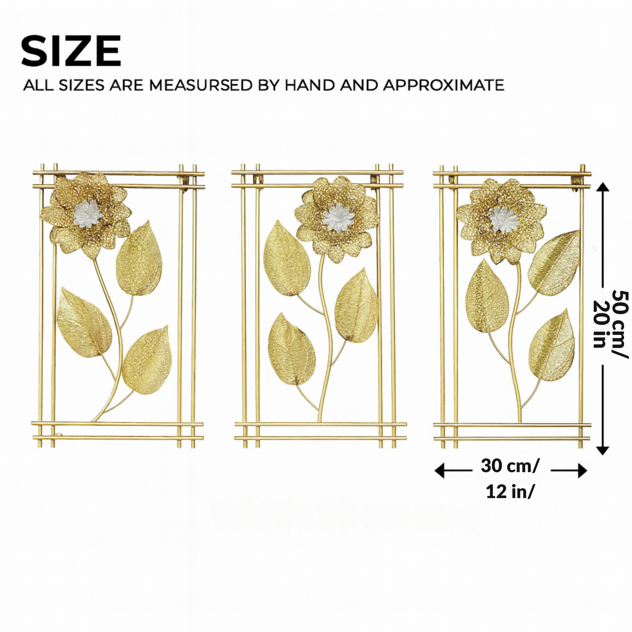 3 Piece Gold Flowers Metal Wall Decor Set, Elegant Floral Sculptures, 50cm Tall x 30cm Wide Panels Home Office Decor