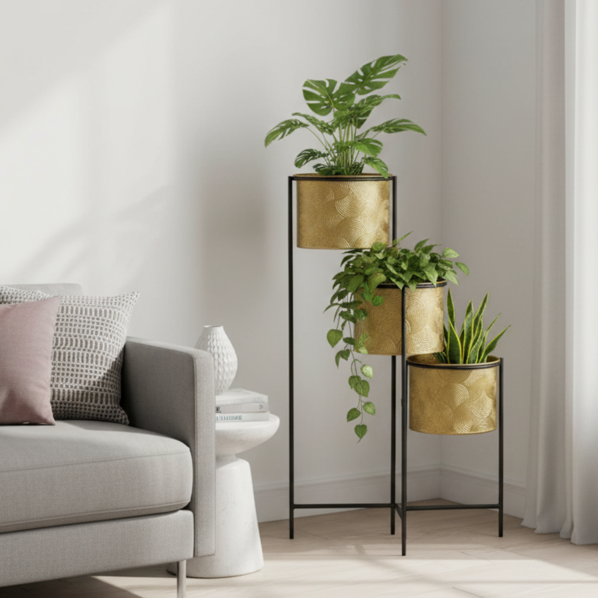 Elevate your home's greenery with this stunning 3-tier vertical plant stand. Standing 32 inches tall, this piece isn't just a planter; it's a statement accent that brings life and sophisticated style to any room. It features three beautifully crafted golden pots, each adorned with a unique, embossed swirl pattern that catches the light and draws the eye. The pots are staggered perfectly on a sleek, black metal frame, creating a striking vertical display. This design is a perfect blend of rustic charm and modern elegance, making it an ideal fit for farmhouse decor while also complementing boho, mid-century, or contemporary spaces. Imagine it brightening a forgotten corner in your living room, greeting guests with fresh greenery in your entryway, or adding a touch of nature to your home office. Its smart, space-saving design is perfect for apartments or anyone looking to display more plants without cluttering the floor. Give your favorite houseplants the stylish home they deserve and instantly transform your space!