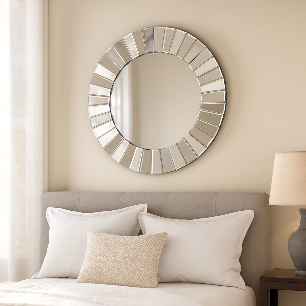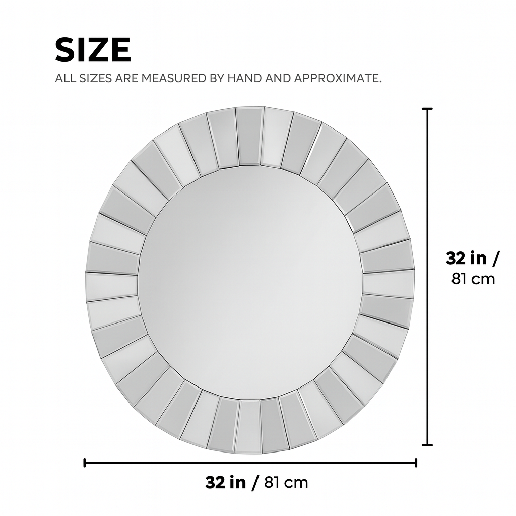 This large round silver glass wall mirror features a sleek frameless design and polished edge for a modern, luxurious look. Measuring 80cm in diameter, this oversized mirror offers a clear, distortion-free reflection ideal for entryways, living rooms, bedrooms, or hallways. Crafted from durable premium glass with high-quality silver backing, it combines long-lasting performance with elegant contemporary style. The mirror is packaged securely for safe delivery and includes mounting hardware for straightforward installation. Enhance your home decor with this chic, decorative ornament that adds depth, light, and sophistication to any space.