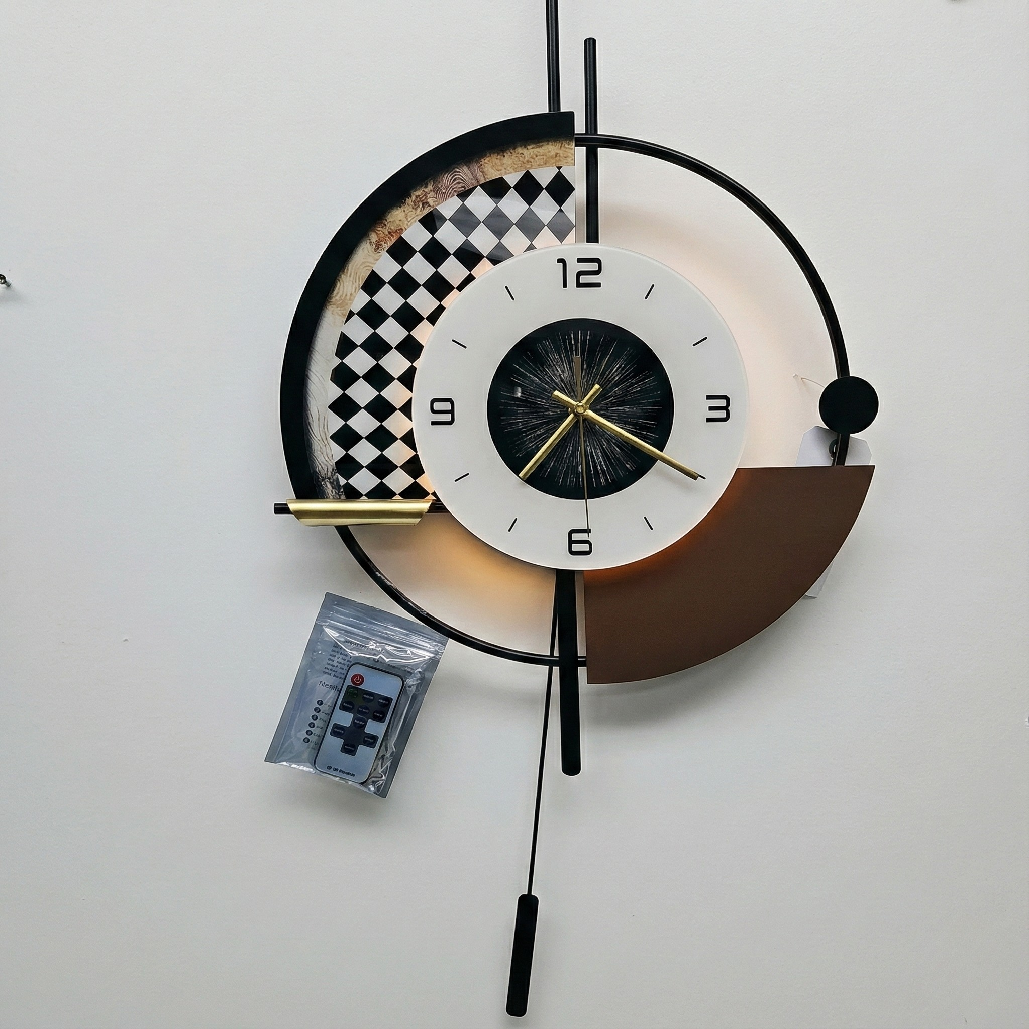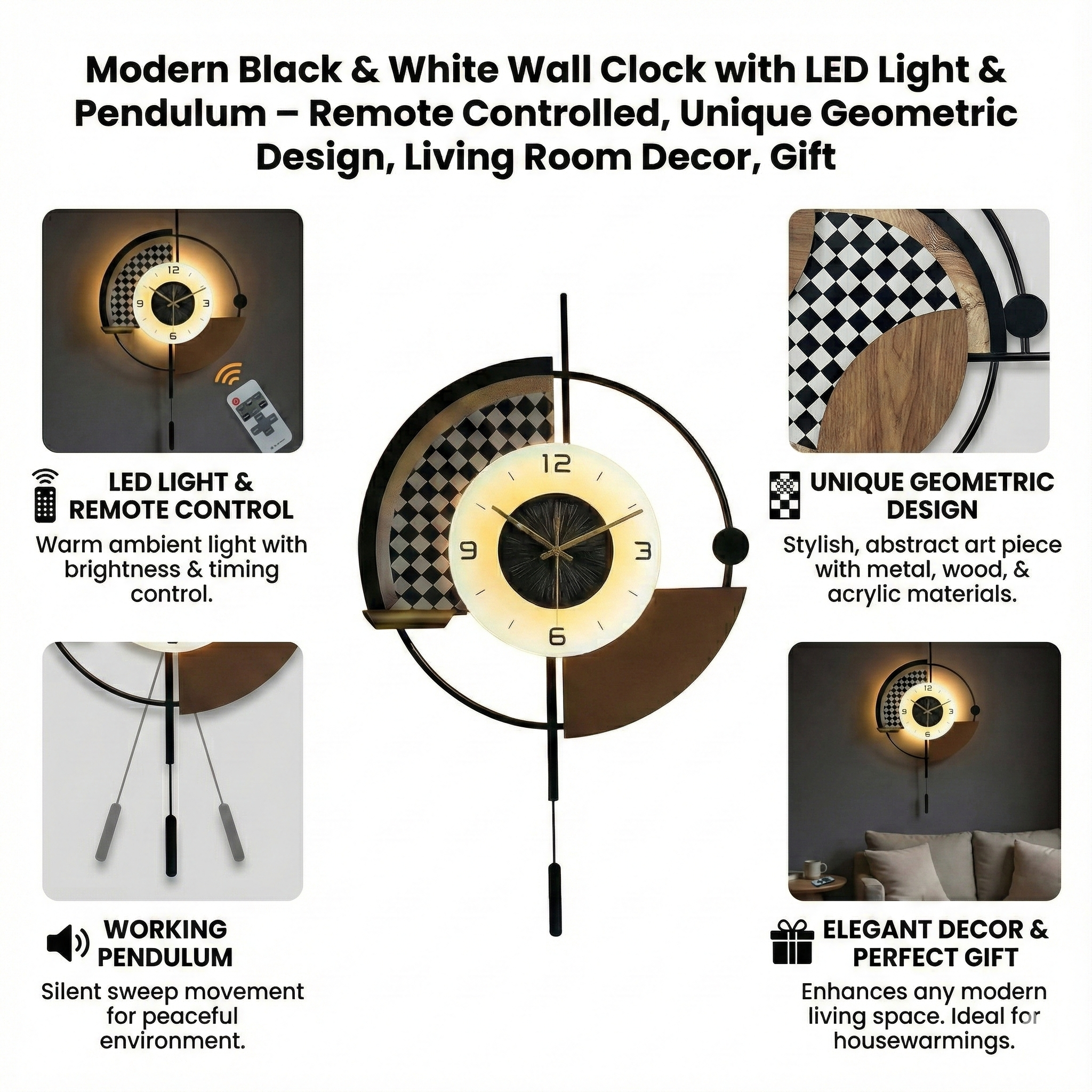Modern Black and White Wall Clock with LED Light, Remote Controlled, Unique Geometric Design, Pendulum, Living Room Decor, Gift