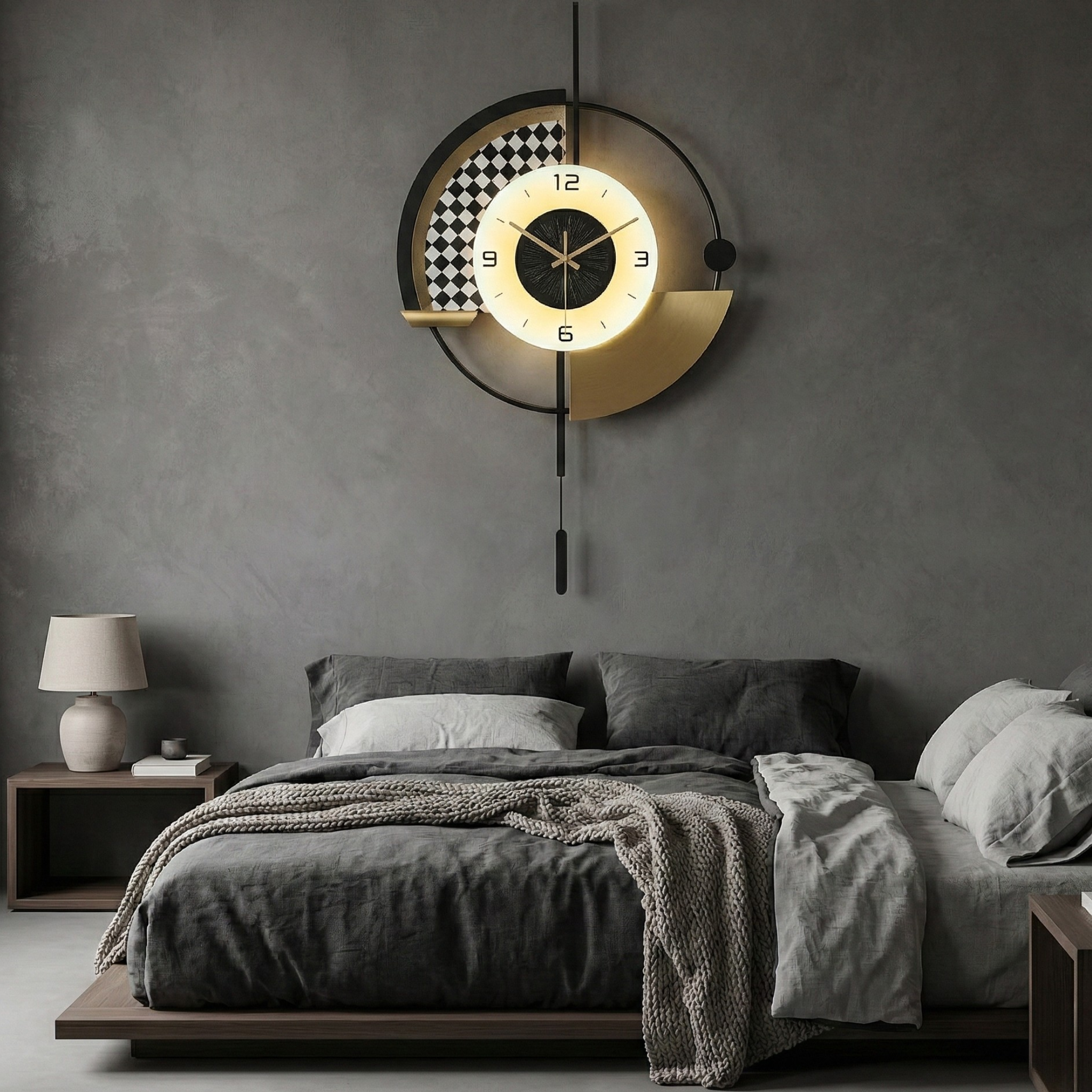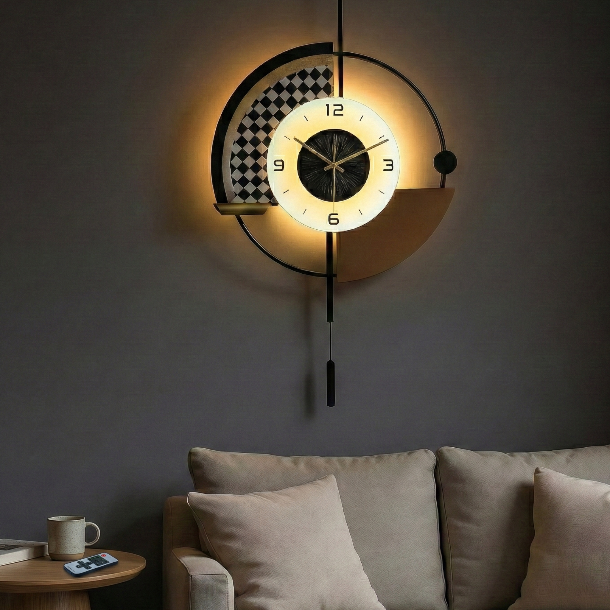 Make a bold statement on your wall with this Modern Black and White Wall Clock featuring an eye-catching geometric design accented by contrasting black, white, gold, and patterns. The remote-operated LED light adds a subtle glow that enhances visibility and creates an ambient atmosphere in any room. This decorative wall clock is a piece of modern art that complements contemporary home or office décor. The clock is made of high-quality metal and acrylic for style and durability. The quartz mechanism ensures quiet, precise timekeeping perfect for bedrooms, living rooms, or workspaces where peace is valued. With its unique semi-circular shapes and pendulum design, this clock combines functionality with avant-garde style. It's also the perfect gift choice for any occasion.