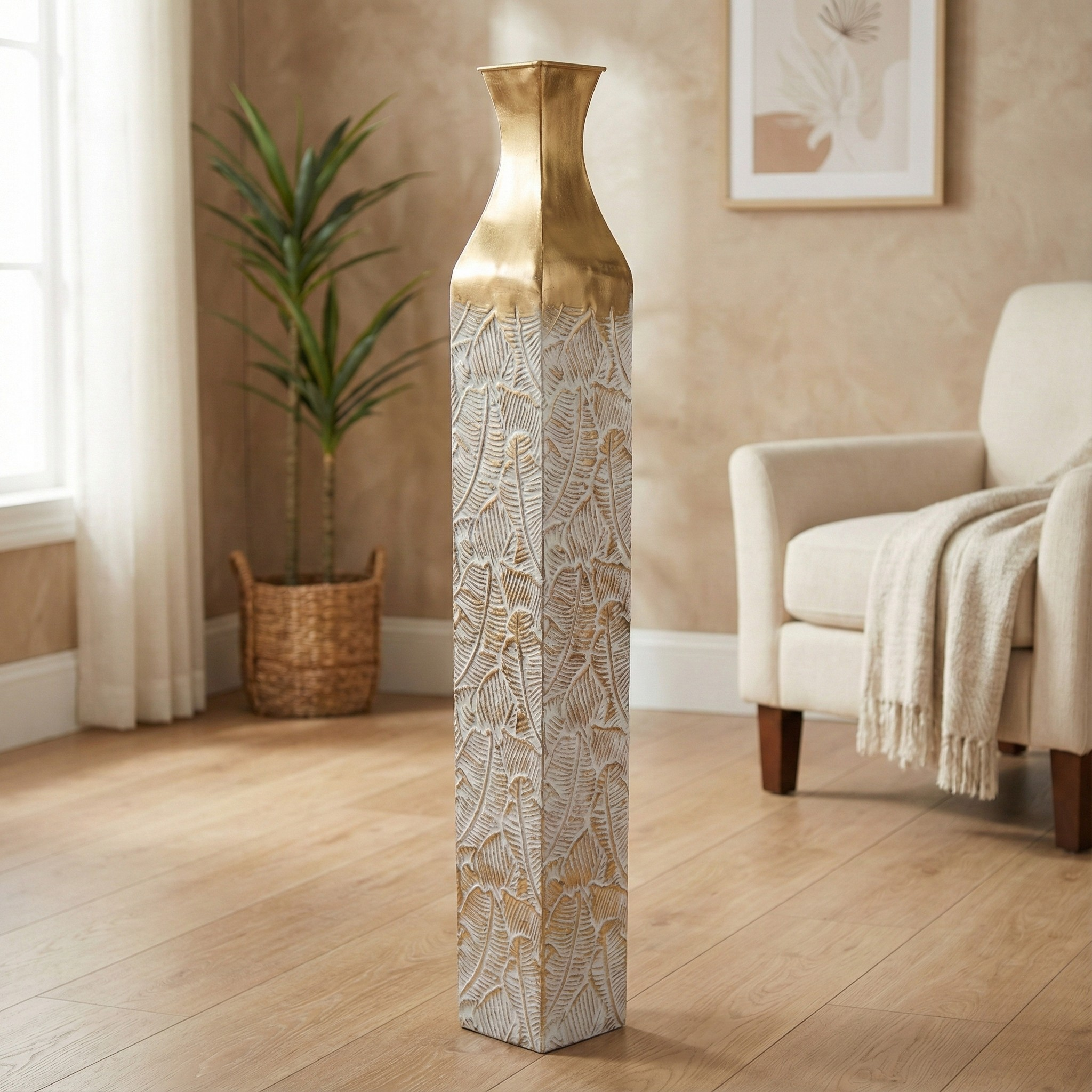 We all want our living spaces to feel warm and fancy at the same time. That's where this Gold Tall Vase for Living Room comes in handy! This rustic weathered finish handmade large gold floor vase is super stylish and easy to use, made of metal, and has a standout pattern. This big 36 inches tall vase can be filled up with your favorite flowers or branches, or leave it empty for a classy minimalist touch. This gold metal flower vase is built to last, so you can enjoy it for a long time. A great addition to any room - from traditional to modern, farmhouse to boho chic. This metal flower vase is great as foyer decor, decor for entryway, or centerpieces for your entrance way ideas and floral arrangements ideas.