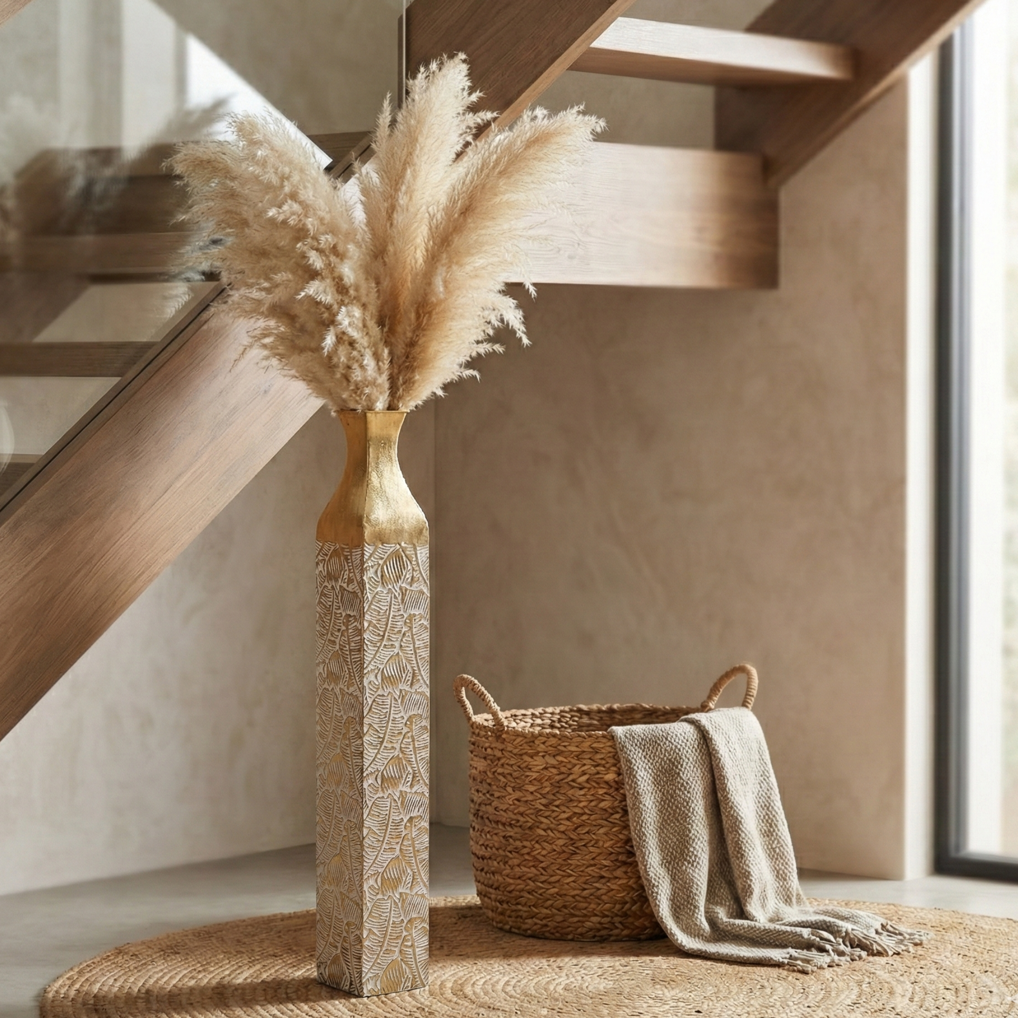 We all want our living spaces to feel warm and fancy at the same time. That's where this rustic weathered finish handmade Gold Tall Vase for Living Room comes in handy! This large gold floor vase is super stylish and easy to use, made of metal, and has a standout pattern. This giant vase can be filled up with your favorite flowers or branches, or leave it empty for a classy minimalist touch. This gold metal flower vase is built to last, so you can enjoy it for a long time. A great addition to any room - from traditional to modern, farmhouse to boho chic. This metal flower vase is great as foyer decor, decor for entryway, or centerpieces for your entrance way ideas and floral arrangements ideas.