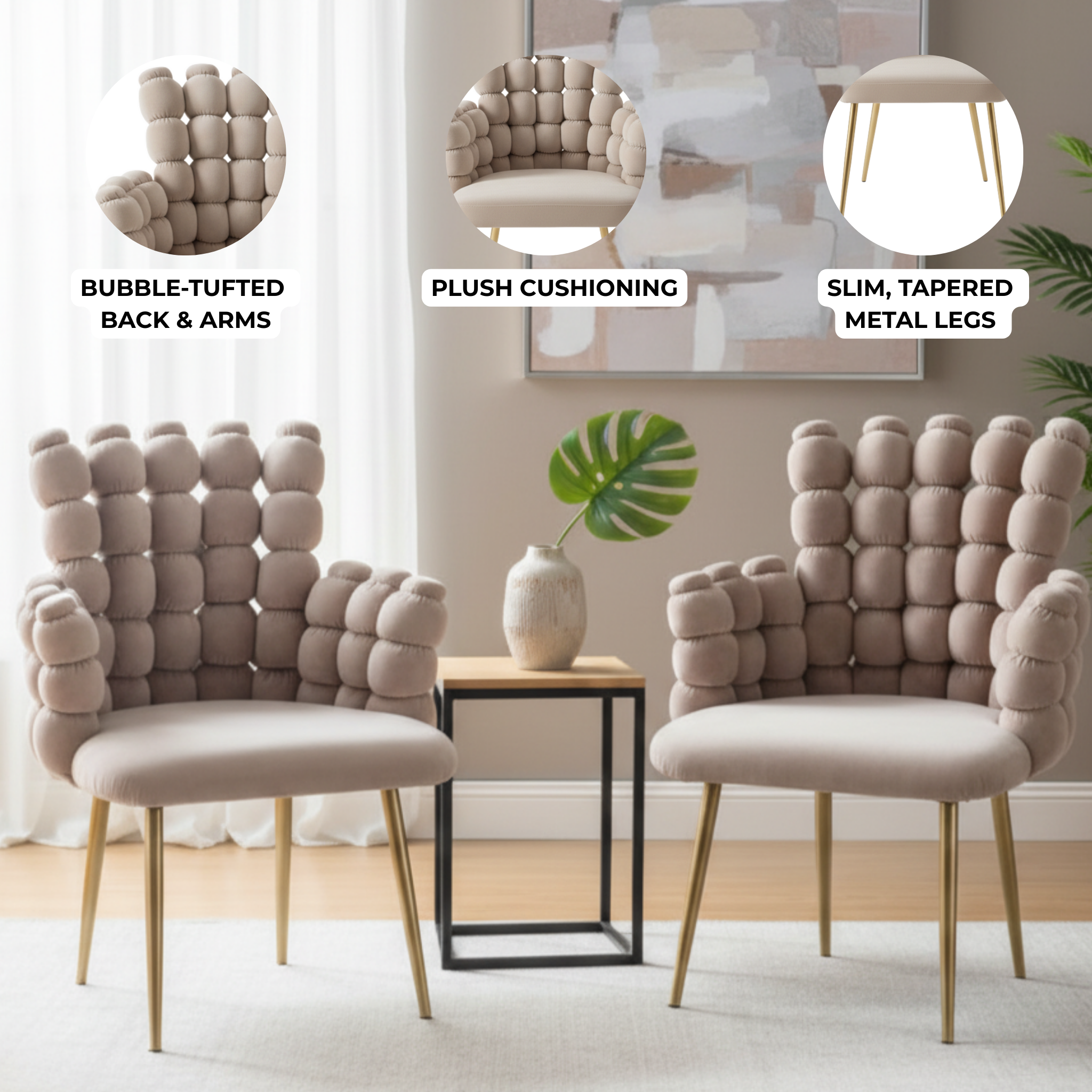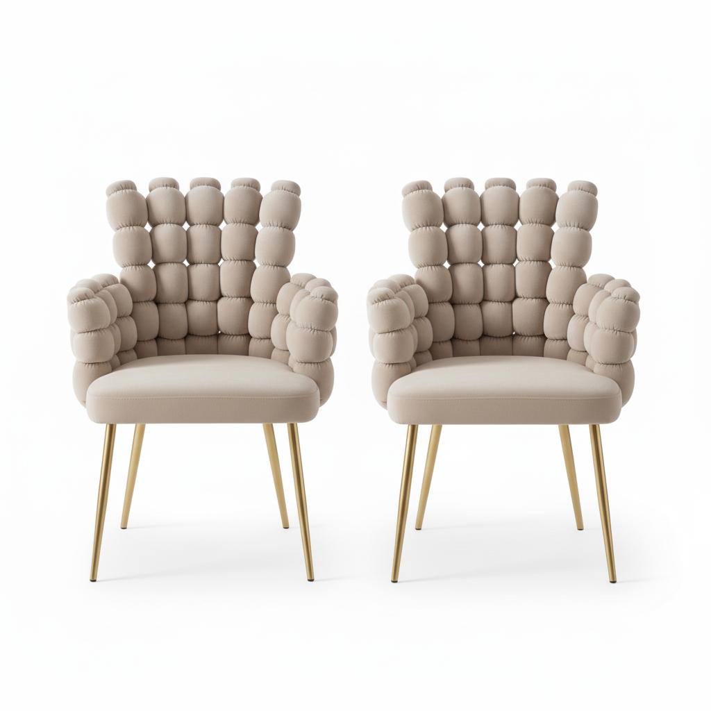 Add some interesting accents to your living room or office space with this set of 2 Modern Beige Upholstered Accent Chairs, featuring plush cushioned backs and seats for outstanding comfort. The unique cushioned block design on the backrest and arms adds contemporary visual interest. Upholstered in soft beige fabric, these chairs offer a warm and inviting look perfect for any style - from classic to modern contemporary. The sleek gold metal frames provide sturdy, durable support while adding a luxurious touch, seamlessly blending modern glam with comfort. These chairs are perfect for creating cozy reading nooks, stylish seating for guests, or enhancing the ambiance of bedrooms, lounges, and reception areas. With their compact yet comfortable design, they offer both functionality and sophistication.