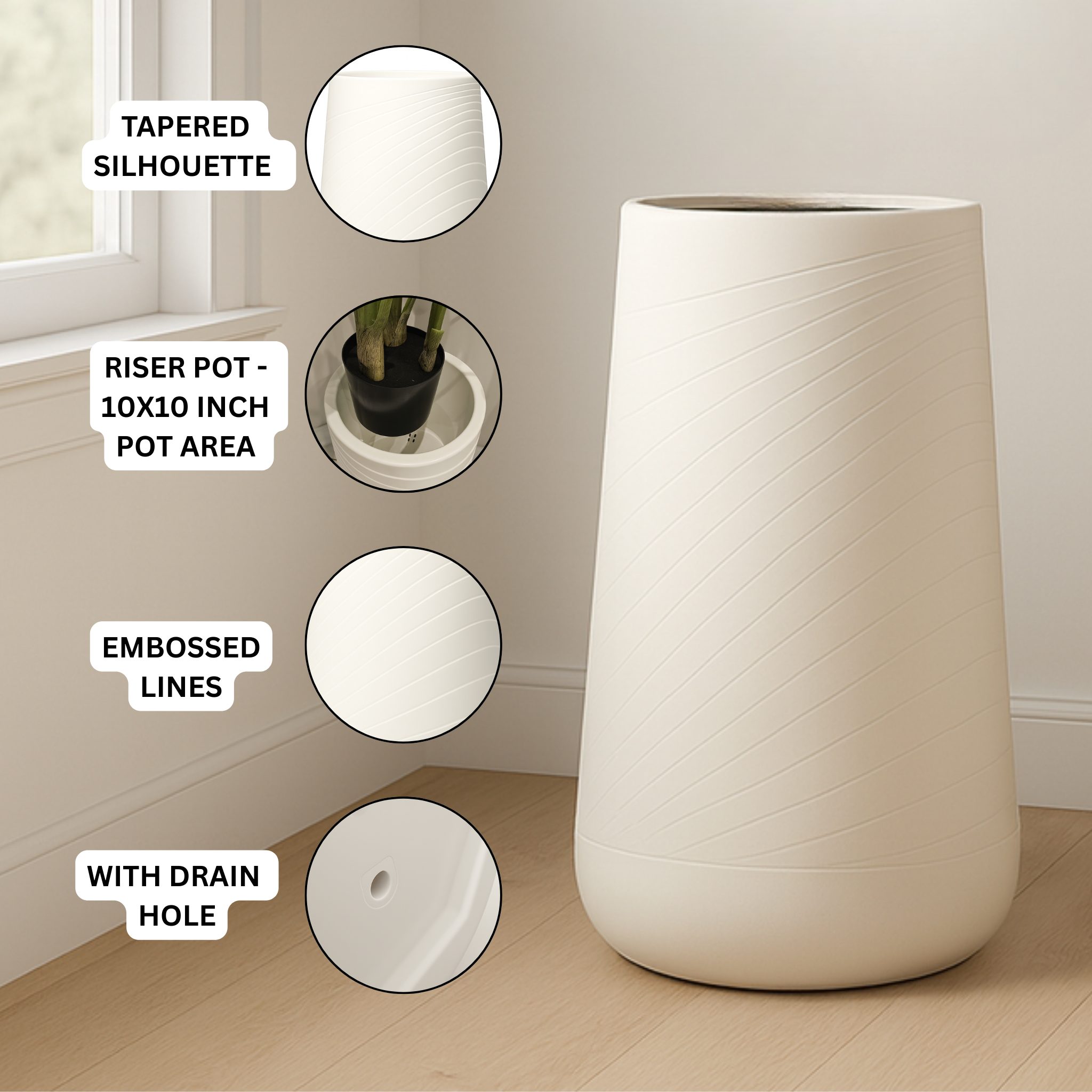 Add a touch of elegance to your space with this Self-Watering Tall White Planter Pot, designed for both indoor and outdoor use. Standing at 27 inches tall, this minimalist mid-century decorative plant pot brings sophisticated charm to any setting - from your home, office, patio, front porch, to your garden, lawn, yard, backyard, or entrance. Finished in white, this plant pot complements any decor style from traditional to mid-century to contemporary. It's a riser pot so the plants sit about 1.5 feet off the ground, raising overall height and making plants more impactful. Prevent overwatering as it comes with drain holes. A great gift for housewarming, Mother's Day, or any other occasion.